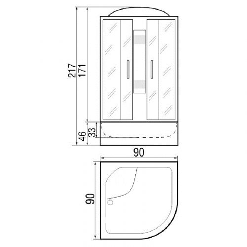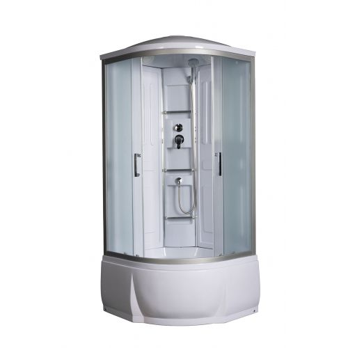 ~ крыша ~ верхний душ ~ вентиляц. отв-я(2шт) ~ центр.стойка ~ держатель д/лейки ~ ручной душ 3-х позиц. ~ полочка-3 шт. ~ смеситель с переключ. режимов ~ сиденье ~ поддон п/кр. выс.со/съем экр.(Н=46 см) ~ сифон