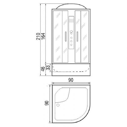 ~ крыша ~ верхний душ ~ вентиляц. отв-я (2шт) ~ цент. стойка ~ ручной душ 3-х позиц. ~ держатель д/лейки ~ полочка ~ смеситель с переключ. режимов ~ сиденье ~ поддон п/кр выс. со/съемн экр.(Н=46см) ~ сифон