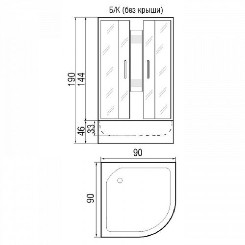~ без крыши ~ цент. стойка ~ ручной душ 3-х позиц. ~ держатель д/лейки ~ смеситель ~ полочка ~ сиденье ~ поддон п/кр выс.со/съем экр. (Н=46 см) ~ сифон