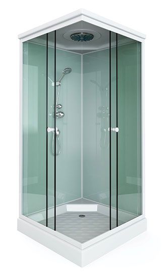 поддон низкий 15см (квадрат) фронтальные стекла: матовые фактурные задние стекла: белые матовые белый алюминиевый профиль регулируемые ролики белые ручки для дверей 2-режимный смеситель ручная лейка (на стенке ) слив с сифоном крыша с верхней лейкой