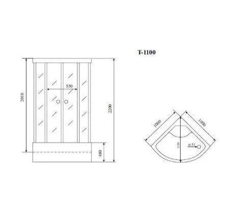 Размер и форма: Кабина имеет ширину и глубину 100 см и высоту 220 см, что обеспечивает комфортное использование для людей любого роста. Ее форма - четверть круга - прекрасно подойдет для угловых ванных комнат.