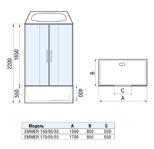 Душевая кабина WW500 EMMER 150/85/55-2 1500х850х2200 с поддоном купить