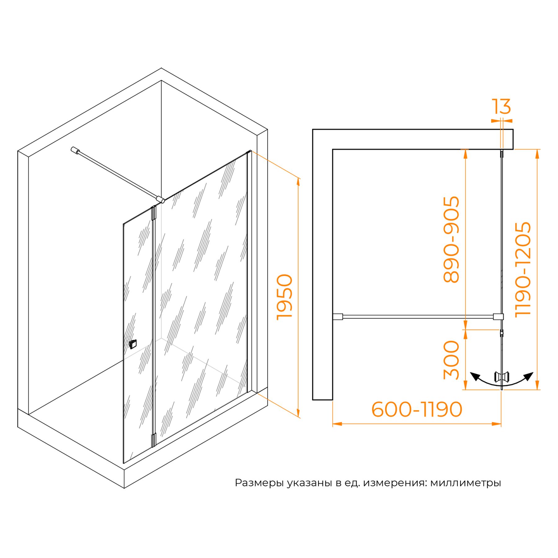 Душевая перегородка состоит из стационарного полотна и полотна с поворотной маятниковой частью - 300 мм. Стационарное стекольное полотно крепится к стене алюминиевым профилем с декоративной заглушкой. Подвижное полотно закреплено стальной маятниковой петлей с ходом 180 градусов.Перегородка выпускается с фурнитурой в 3-х вариантах: