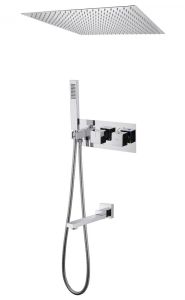 Душевой комплект ABBER отлично дополнит ванную комнату своим незаменимым функционалом. Душевые комплекты ABBER включают в себя все необходимое для создания идеального душевого пространства. Душевой комплект ABBER производится из высококачественных материалов, с отсутствием вредных примесей. Основной цвет исполнения ABBER – хром, идеально подходящий к душевой зоне выполненной в стиле hi-tech. Душевой комплект ABBER правильное решение в оснащении ванной комнаты.Душевая система скрытого монтажа с изливом, термостат, хром