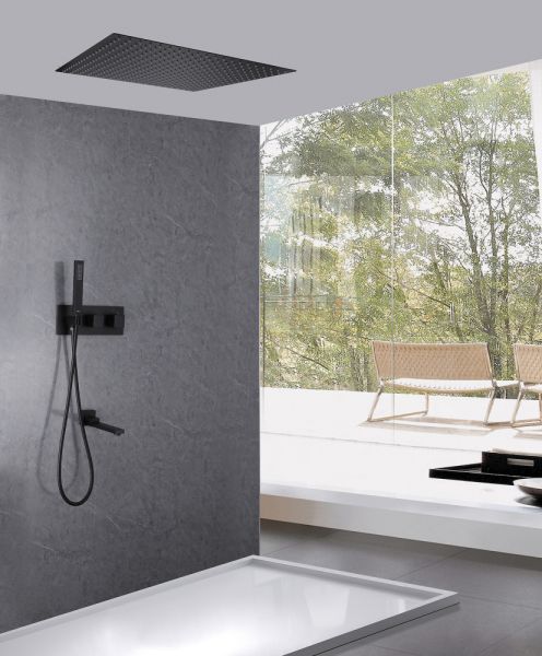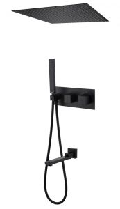 Душевой комплект ABBER отлично дополнит ванную комнату своим незаменимым функционалом. Душевые комплекты ABBER включают в себя все необходимое для создания идеального душевого пространства. Душевой комплект ABBER производится из высококачественных материалов, с отсутствием вредных примесей. Основной цвет исполнения ABBER – хром, идеально подходящий к душевой зоне выполненной в стиле hi-tech. Душевой комплект ABBER правильное решение в оснащении ванной комнаты.Душевая система скрытого монтажа с изливом, термостат, черная матовая