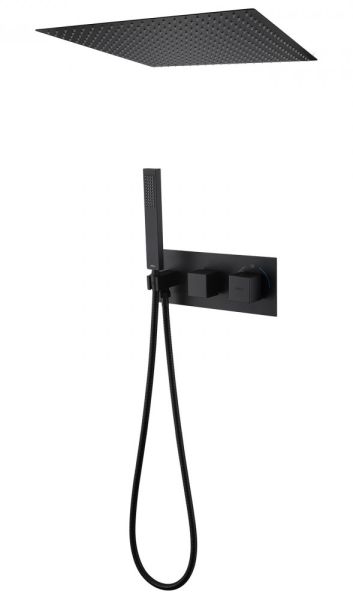 Душевой комплект ABBER отлично дополнит ванную комнату своим незаменимым функционалом. Душевые комплекты ABBER включают в себя все необходимое для создания идеального душевого пространства. Душевой комплект ABBER производится из высококачественных материалов, с отсутствием вредных примесей. Основной цвет исполнения ABBER – хром, идеально подходящий к душевой зоне выполненной в стиле hi-tech. Душевой комплект ABBER правильное решение в оснащении ванной комнаты.Душевая система скрытого монтажа без излива, термостат, черная матовая