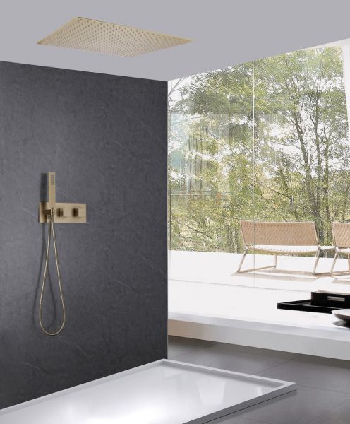 Душевой комплект ABBER отлично дополнит ванную комнату своим незаменимым функционалом. Душевые комплекты ABBER включают в себя все необходимое для создания идеального душевого пространства. Душевой комплект ABBER производится из высококачественных материалов, с отсутствием вредных примесей. Основной цвет исполнения ABBER – хром, идеально подходящий к душевой зоне выполненной в стиле hi-tech. Душевой комплект ABBER правильное решение в оснащении ванной комнаты.Душевая система скрытого монтажа без излива, термостат, золото матовое