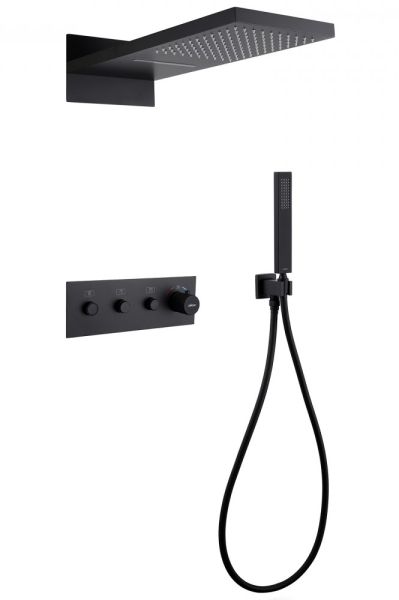 Душевой комплект ABBER отлично дополнит ванную комнату своим незаменимым функционалом. Душевые комплекты ABBER включают в себя все необходимое для создания идеального душевого пространства. Душевой комплект ABBER производится из высококачественных материалов, с отсутствием вредных примесей. Основной цвет исполнения ABBER – хром, идеально подходящий к душевой зоне выполненной в стиле hi-tech. Душевой комплект ABBER правильное решение в оснащении ванной комнаты.Душевая система скрытого монтажа без излива, термостат, черная матовая