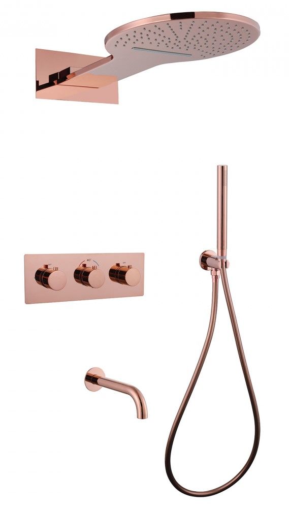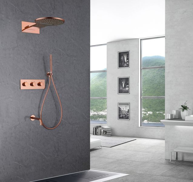 Душевой комплект ABBER роскошно дополнит вашу ванную комнату своим незаменимым функционалом. Душевые комплекты ABBER включают в себя все необходимое для создания идеального душевого пространства. Душевой комплект ABBER производится из высококачественных материалов, с отсутствием вредных примесей. Душевой комплект ABBER правильное решение в оснащении ванной комнаты.Душевая система скрытого монтажа с изливом, термостат, розовое золото
