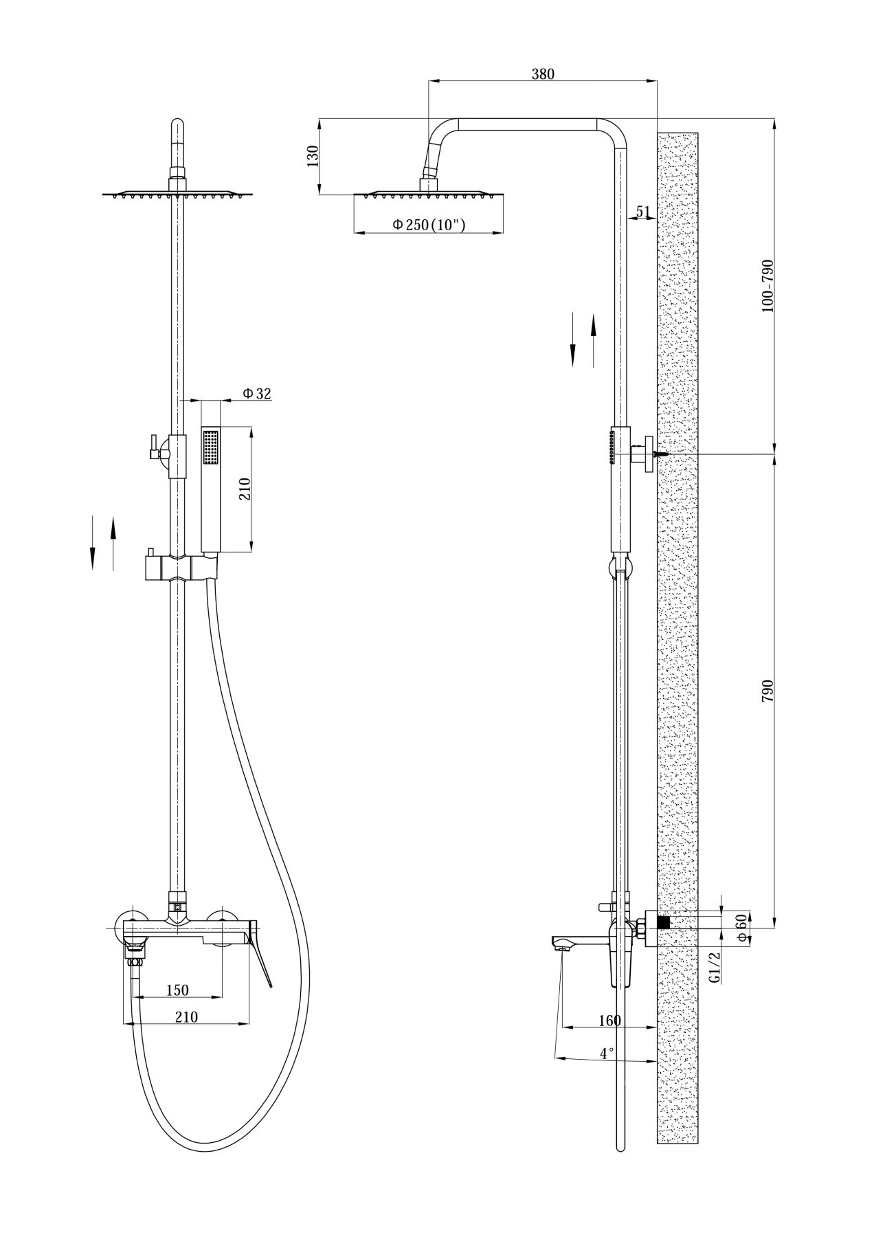 Функциональность: верхний и ручной душ, регулируемая высота, система защиты от перекручивания.