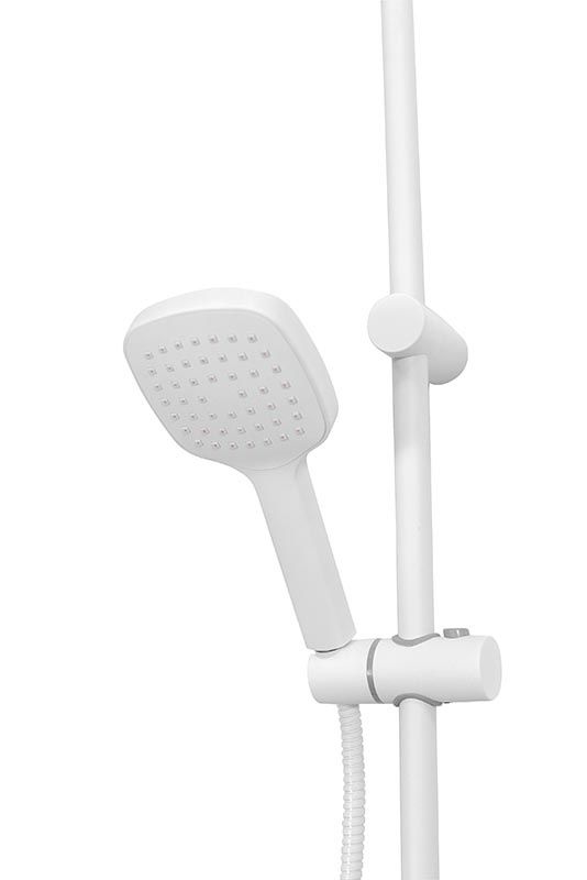 Душевая система в цвете белый глянец: верхний душ (230х230 мм) создаёт эффект тропического дождя, что дарит непередаваемые эмоции во время ежедневных банных процедур. Ручной душ 120 мм (1 режим) на гибком полутораметровом шланге (в металлической оплетке) с защитой от перекручивания. Держатели верхнего и ручного душа с регулировкой угла наклона, штанга 970 мм. Подвижные детали отличаются долговечностью. Фиксируется душевая система непосредственно на стене, что позволяет рационально использовать ограниченное пространство ванной комнаты.