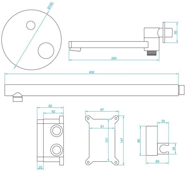 • Головной душ, горизонтальный держатель - нержавеющая сталь