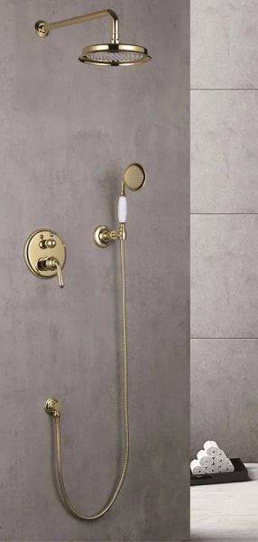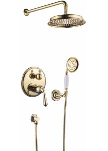 Душевая система встраиваемая Rose R0235E, золото.Монтаж: внутренний (скрытый).Стилистика дизайна: ретро.Управление: рычажное.Размер верхнего душа: 23x23.Форма верхнего душа: круглая.