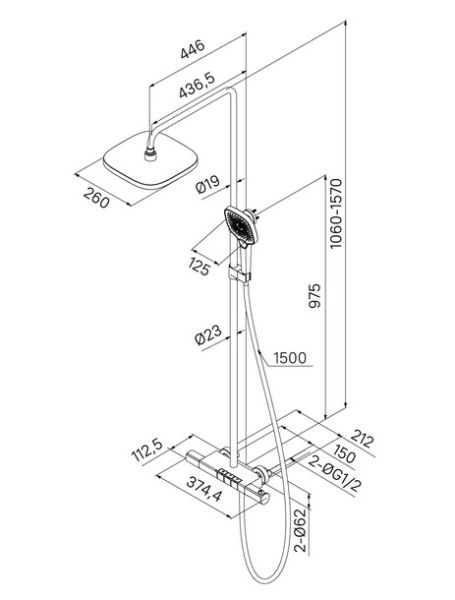 В комплекте: верхняя лейка 260х260х65 мм, ручная лейка с 3 режимами 270х125 мм, гладкий душевой шланг 1,5 м. Гарантия на смеситель – 10 лет, на душевые аксессуары – 3 года.