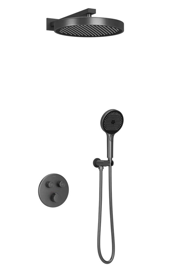 Душевой комплект SANCOS Space встраиваемый, c термостатическим смесителем, верхним, ручным душем и шлангом в комплекте, цвет вороненая сталь, арт. SC3006GMG