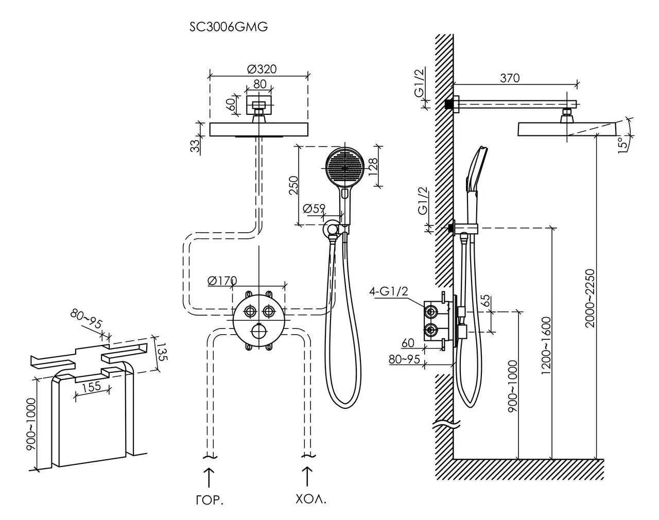 Размер верхнего душа, см:32