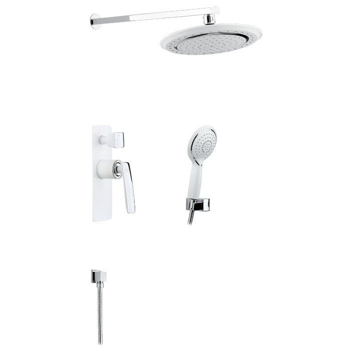 Комплект скрытого монтажа Timo Helmi SX-4069/00-16SM (412) chrome white изготовлен финской компанией Timo в сочетании цветов «белый/хром». Он выполнен из латуни класса А – прочного и устойчивого к коррозии материала. В качестве материала леек используется пластик. Комплект состоит из верхнего и двухрежимного ручного душа, шлангового подключения, смесителя без излива и скрытой монтажной части. Верхняя лейка с подачей воды в режиме «Тропический дождь» может поворачиваться во все стороны (угол наклона 45°). Переключение между лейками и изливом осуществляется с помощью рычажного дивертора.