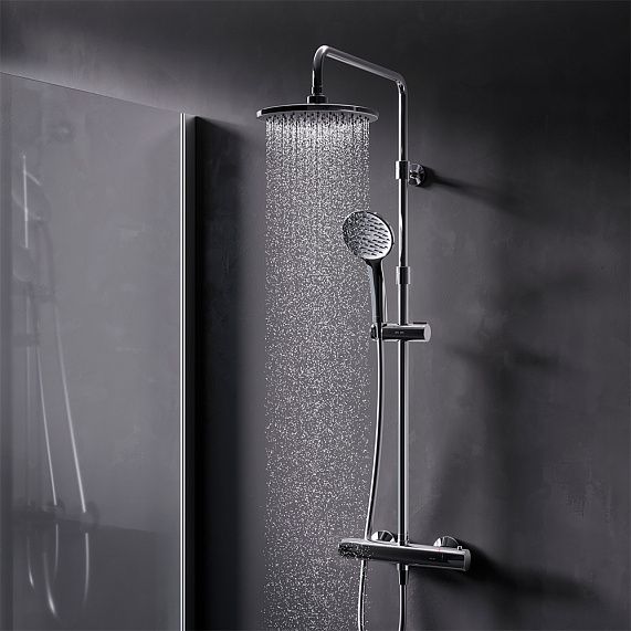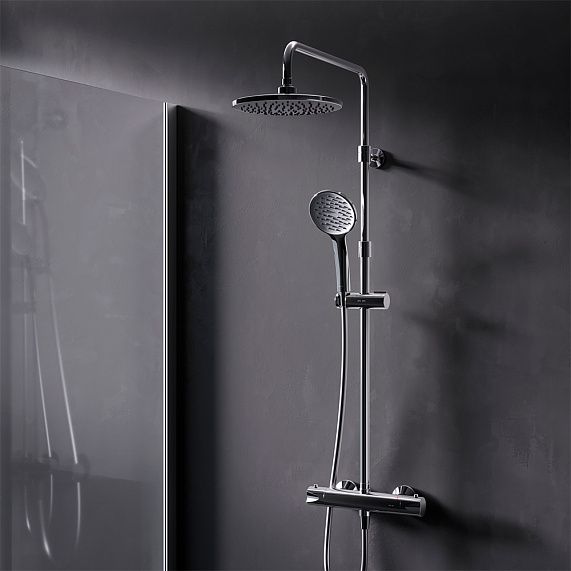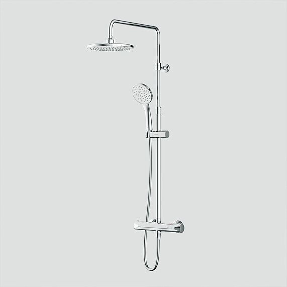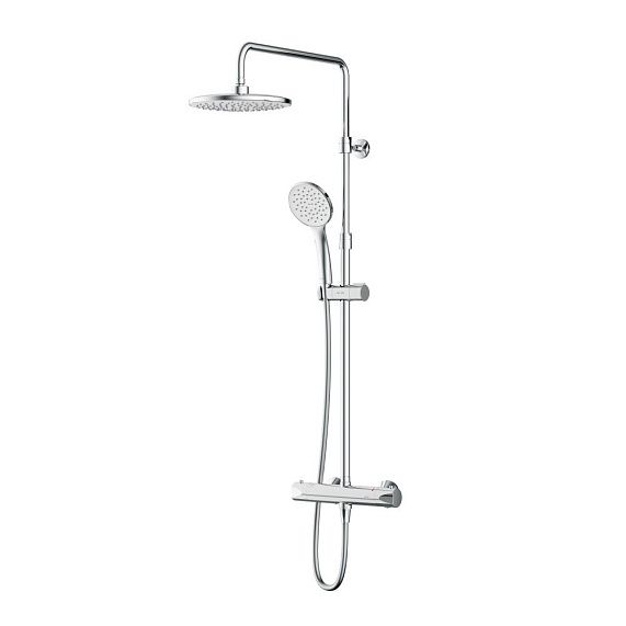 В комплектацию душевой системы входят: тропический душ, ручной душ, смеситель-полочка с термостатом, эксцентрики, держатели штанги и душа. Длина душевой штанги - 1030-1460 мм. Длина душевого шланга - 1750 мм. Размер ручного душа - 130х103 мм. Диаметр верхнего душа - 300х210 мм.