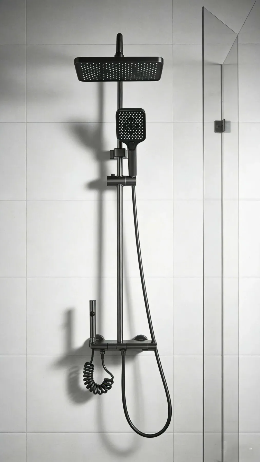 Система выполнена из прочной латуни с защитой от скручивания шланга, что гарантирует долговечность. Комплект включает верхний душ, лейку, шланг и смеситель — всё необходимое для создания полноценной душевой зоны.