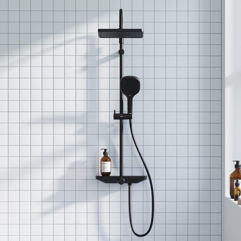 Душевая стойка Damixa Merkur 940730300 Черная матоваяЧистые геометричные линии душевой системы Merkur в сочетании с черным матовым покрытием идеально впишутся в интерьер современной ванной комнаты в скандинавском стиле. Несмотря на минималистичный дизайн, душевые системы этой серии отличаются широким функционалом и необычайной эргономичностью. Продуманные детали: корпус смесителя выполнен в виде удобной полочки из закаленного стекла, на которой можно разместить необходимые под рукой вещи. Невидимый излив совмещает в себе эстетику и удобство. Простое и интуитивное управление: регулируйте температуру воды и переключайте потоки между изливом, ручной и верхней лейкой плавным поворотом двухуровневой ручки. Настоящее SPA прямо у вас дома: увеличенный размер тропической лейки с регулируемым углом наклона (220 мм) и 3 режима ручного душа сделают ваши ежедневные ритуалы незабываемыми. Благодаря телескопической штанге с диапазоном регулировки в 400 мм водные процедуры будут одинаково комфортны абсолютно для всех членов семьи. Специальное PVD-покрытие гарантирует чрезвычайную прочность душевой системы. Матово-черная поверхность не выцветает с годами и устойчива к механическим повреждениям, загрязнениям и отпечаткам пальцев.