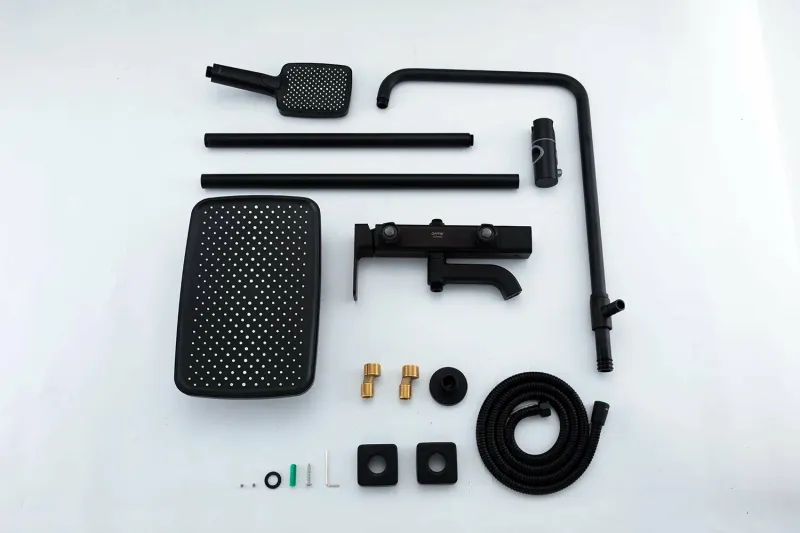 В комплект также входит душевая штанга, ручной душ с 3 режимами работы и шланг длиной 1500 мм. Держатель для лейки и кронштейн для верхнего душа входят в комплект, что обеспечивает удобство использования и хранения.