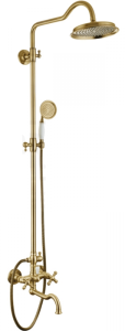 Душевая стойка Gappo G2489-4 изготовлена из латуни в стиле ретро. Состоит из верхнего тропического душа, двухвентильного смесителя с поворотным изливом, ручной лейки (1 режим) с держателем и душевым шлангом (150 см). Угол наклона верхней лейки изменяется при помощи поворотного шарнира. Душевая стойка легко очищается от известкового налета, а корпус из латуни прослужит долгое время. Цвет - бронза.