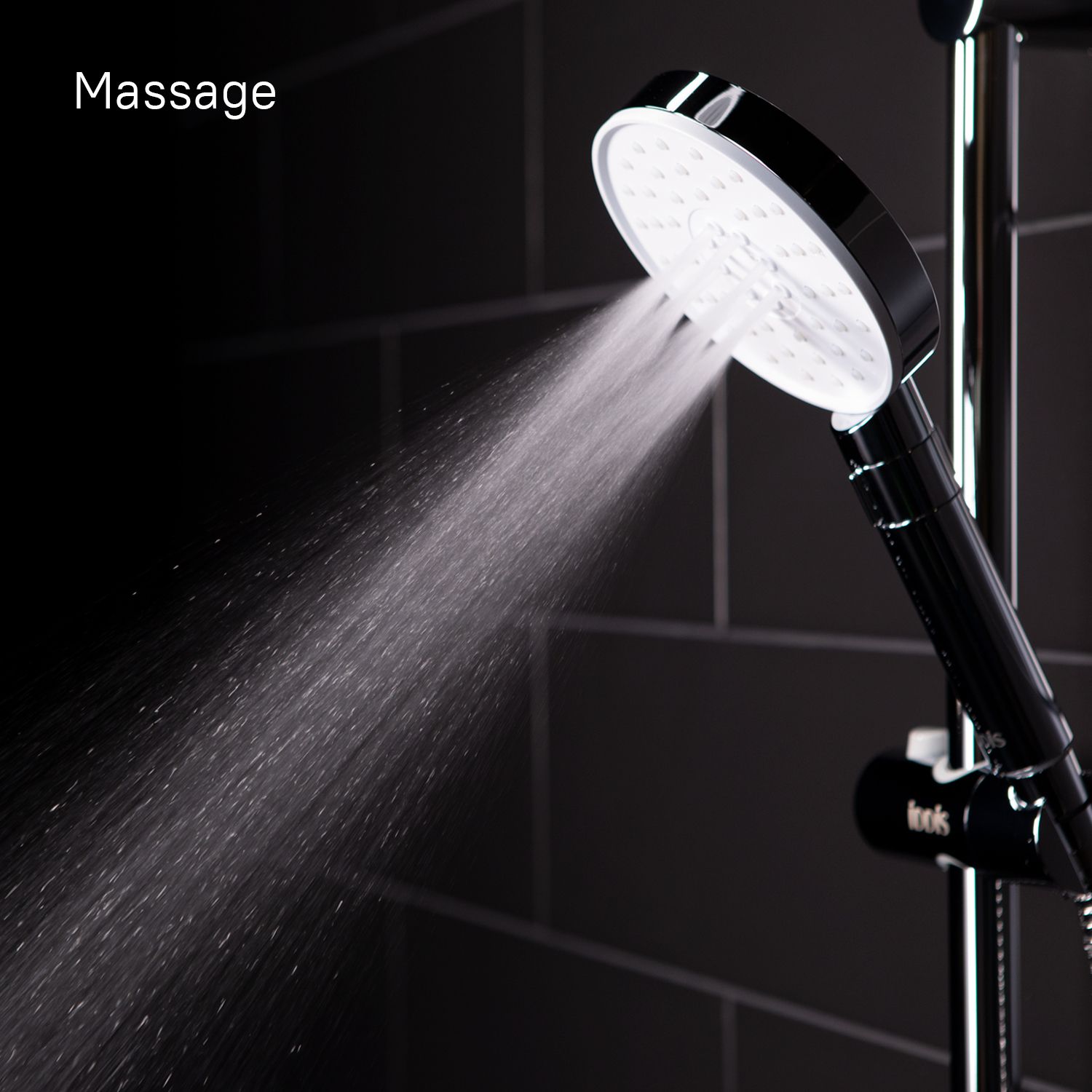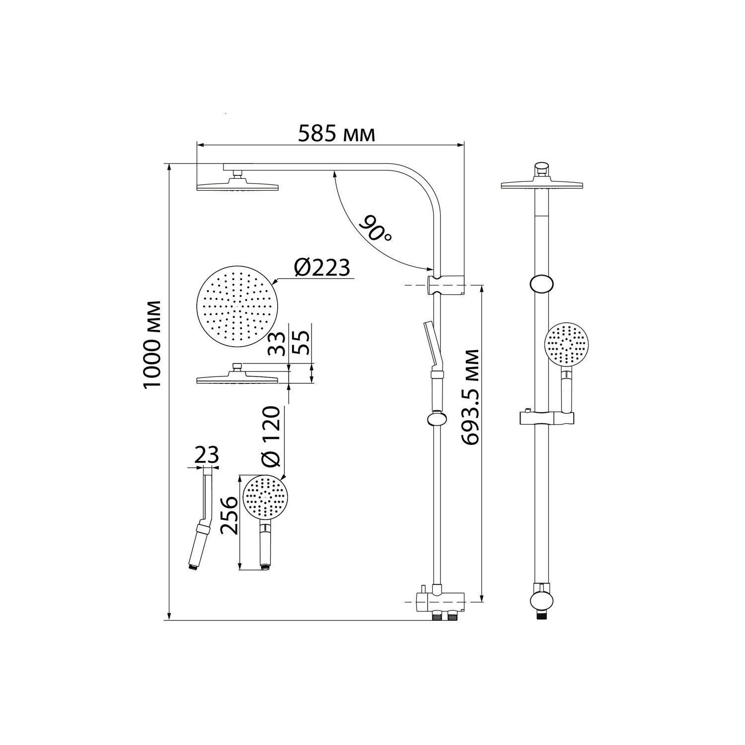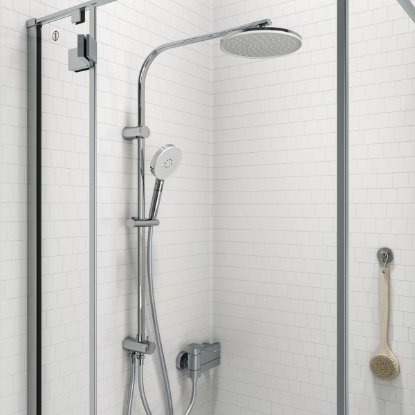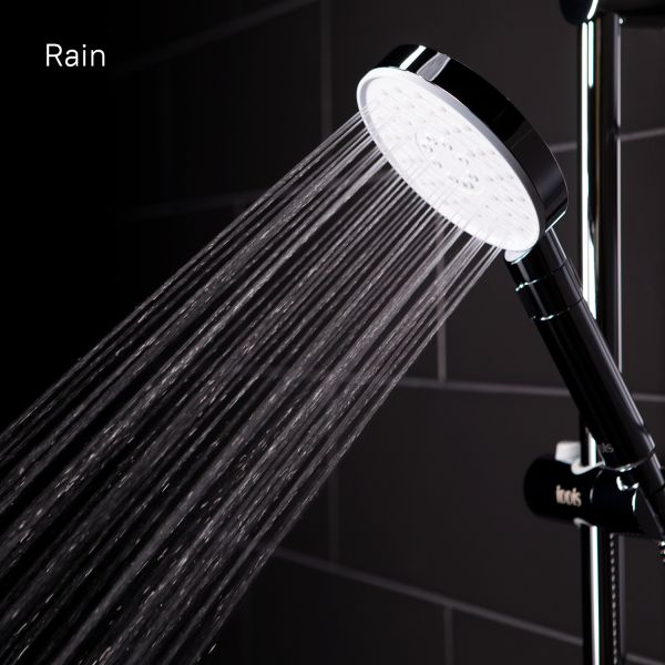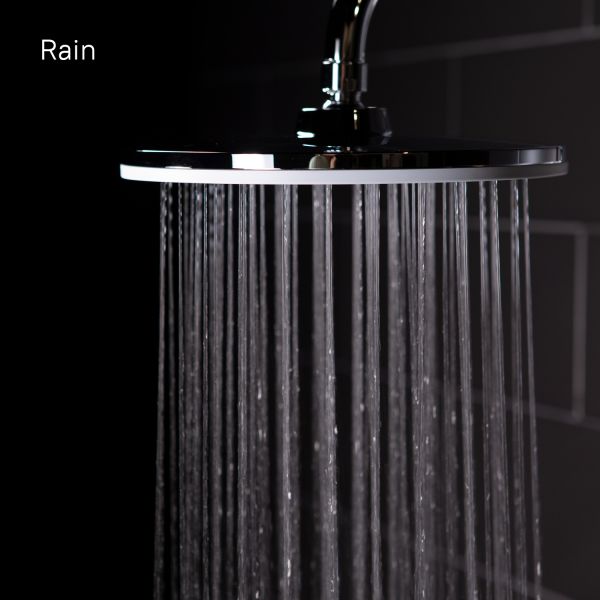 Душевой гарнитур с верхней лейкой. Стойка из нержавеющей стали с никель-хромовым покрытием, высота стойки 970 мм. Материал корпуса дивертора - ABS-пластик. Шланг для душа из ПВХ, 1,5 м и 0,6 метра, цвет серебряный, с системой от перекручивания Twist Free. Верхняя лейка из ABS-пластика, диаметр 225 мм, хром/белый матовый. Ручная лейка из ABS-пластика, диаметр 120 мм, хром/белый матовый, 3 режима (Rain, Massage, Rain&Massage), переключение на ручке с помощью слайдера. В комплекте: крепеж.