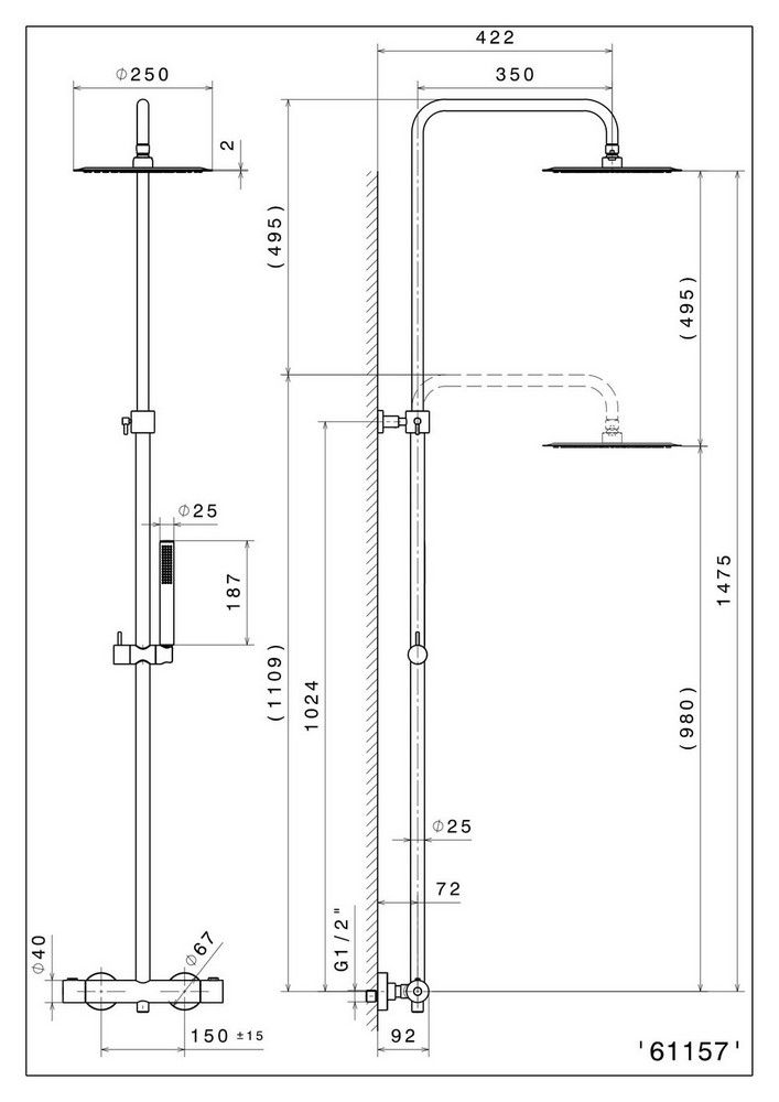 Душевая колонна с термостатическим смесителем в комплекте с переключателем потоков, круглой верхней одноструйной душевой лейкой из нержавеющей стали, с ручным душем и шлангом из ПВХ. Внимание: для чистки черных и цветных изделий можно применять только мягкую губку и мыльный раствор. Использование моющих и абразивных средств запрещено.