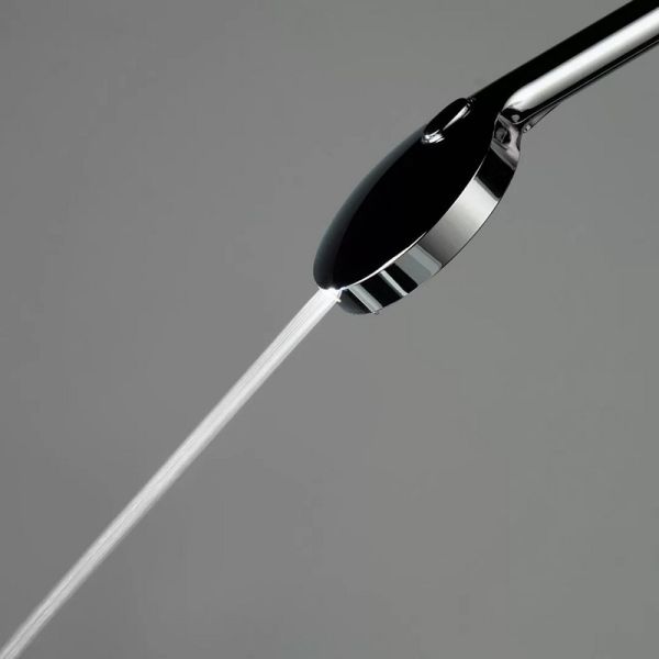 Верхний душ и ручная лейка имеют форму круга. Стойка выполнена из нержавеющей стали, круглая в сечении. У ручной лейки предусмотрены четыре режима потока. Регулировка высоты при установке – 1114-1874 мм.