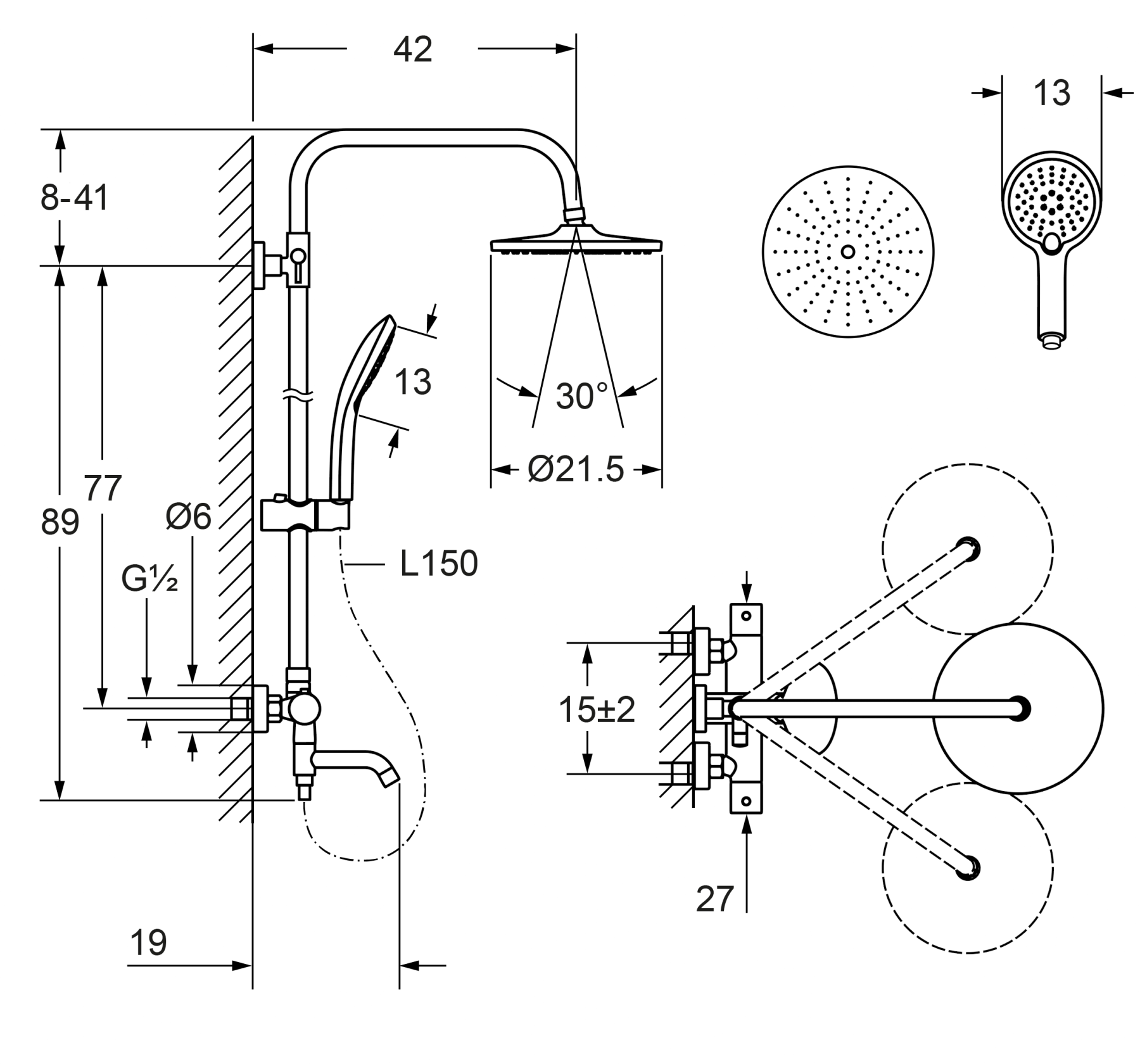 верхний душ, ручной душ, душевой шланг, s-образные эксцентрики, набор прокладок