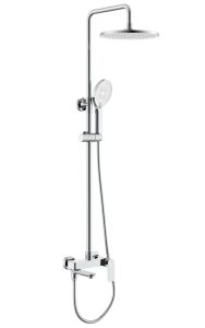 Душевая система Raglo R03.24.Цвет: хром.Материал: латунь.Управление: однорычажное.Механизм: керамический картридж.Излив: поворотный. Аэратор.Регулируемая по высоте душевая штанга: 1065-1565 мм.Форма верхнего душа: круглая.Диаметр верхнего душа: 255 мм.Регулируемый по высоте и наклону держатель ручного душа.Форма ручного душа: круглая.Количество режимов струи ручного душа: 3.Отверстия для монтажа: 3.Стандарт подводки: G 1/2.Монтаж: на стену.