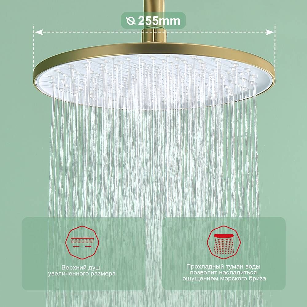 Душевая система Raglo R03.24.03Цвет: сатин золотой.Материал: латунь.Управление: однорычажное.Механизм: керамический картридж.Излив: поворотный. Аэратор.Регулируемая по высоте душевая штанга: 1065-1565 мм.Форма верхнего душа: круглая.Диаметр верхнего душа: 255 мм.Регулируемый по высоте и наклону держатель ручного душа.Форма ручного душа: круглая.Количество режимов струи ручного душа: 3.Отверстия для монтажа: 3.Стандарт подводки: G 1/2.Монтаж: на стену.