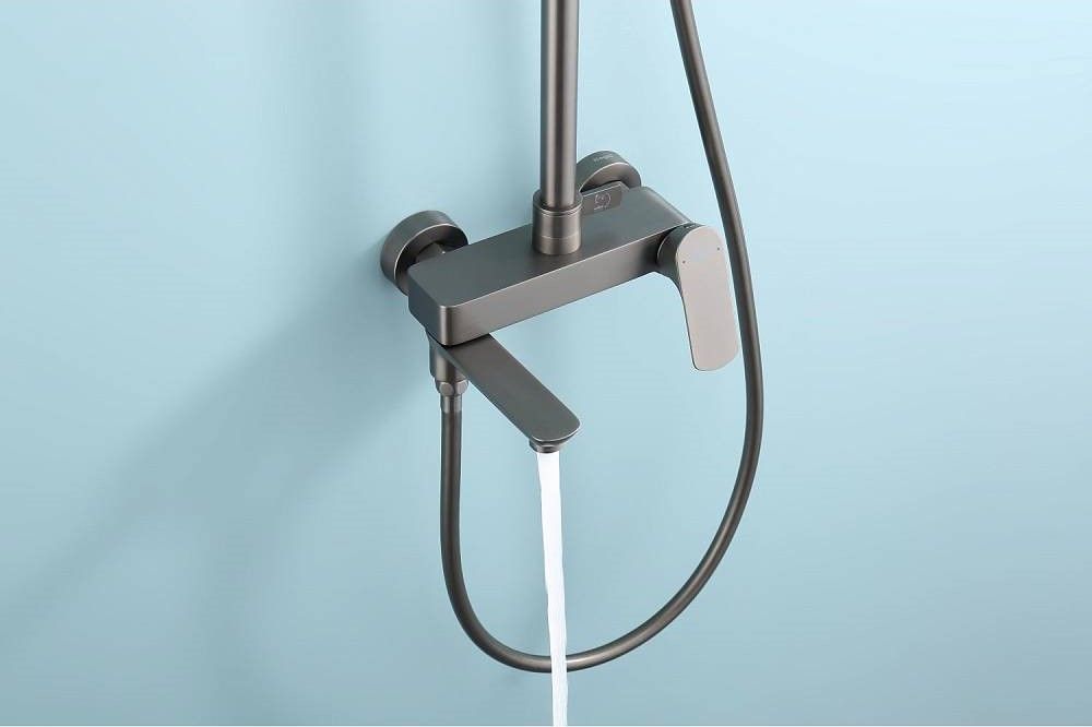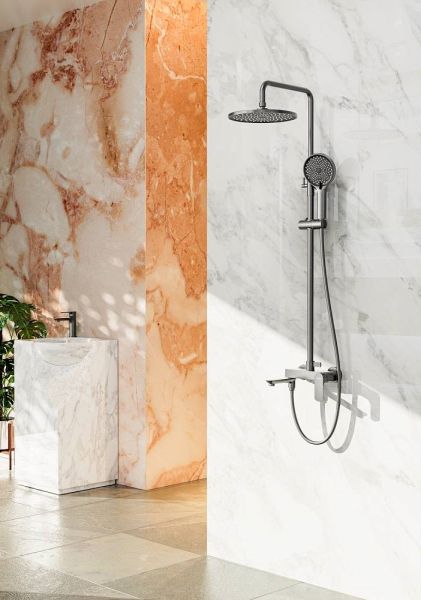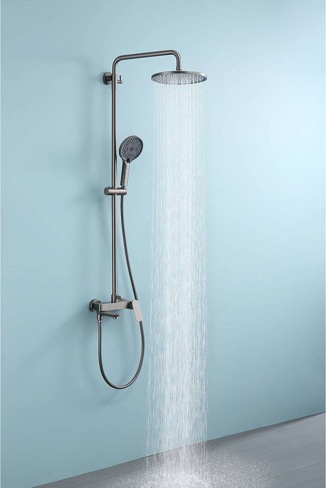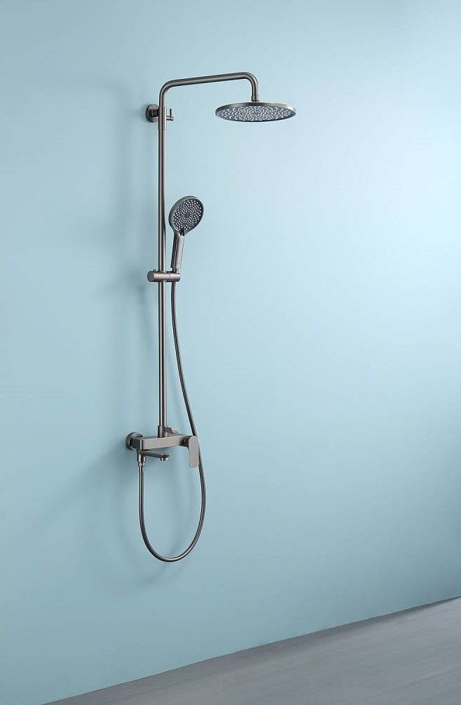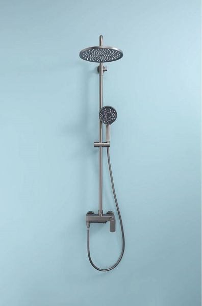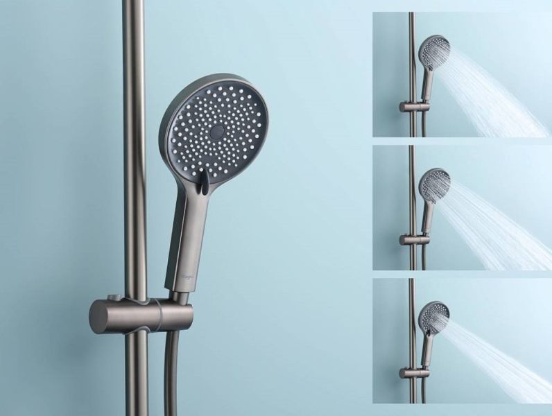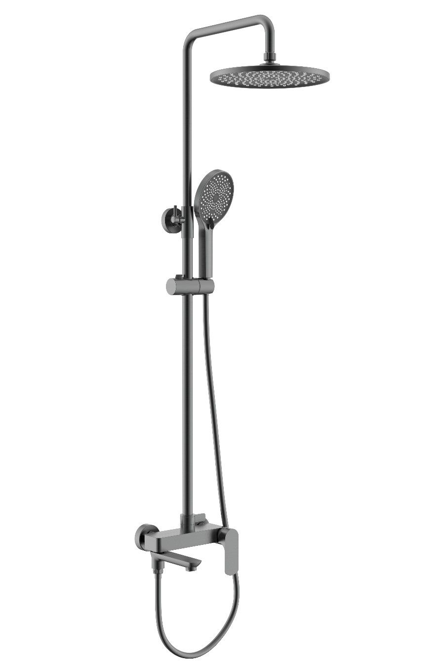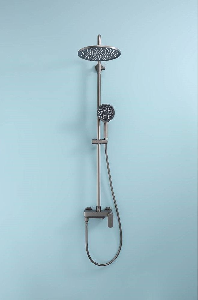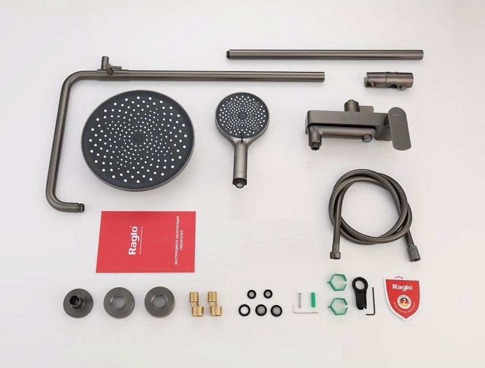 Душевая система Raglo R03.24.09Цвет: графит.Материал: латунь.Управление: однорычажное.Механизм: керамический картридж.Излив: поворотный. Аэратор.Регулируемая по высоте душевая штанга: 1065-1565 мм.Форма верхнего душа: круглая.Диаметр верхнего душа: 255 мм.Регулируемый по высоте и наклону держатель ручного душа.Форма ручного душа: круглая.Количество режимов струи ручного душа: 3.Отверстия для монтажа: 3.Стандарт подводки: G 1/2.Монтаж: на стену.
