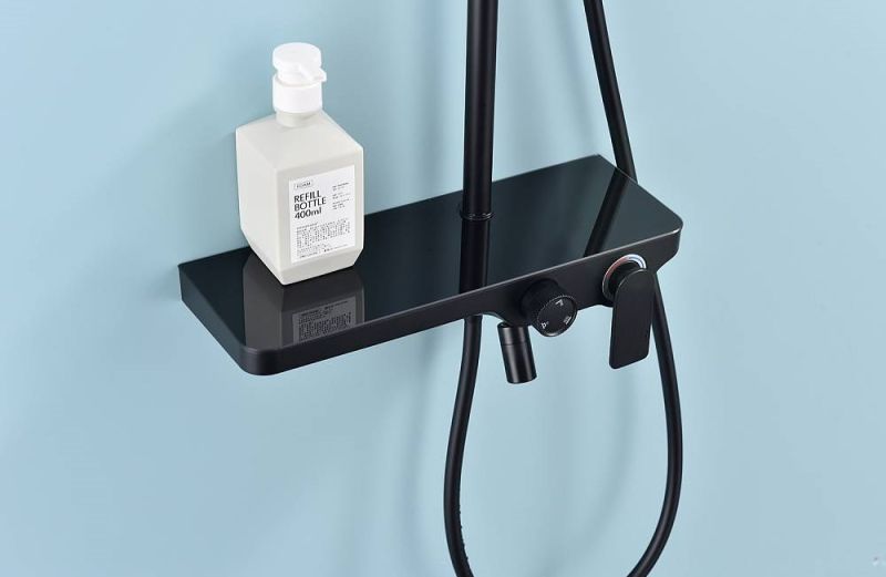 Душевая система Raglo R60.24.06Материал: латунь.Управление: однорычажное.Механизм: керамический картридж.Скрытый излив с аэратором.Полка из стекла.Регулируемая по высоте душевая штанга: 1100-1530 мм.Форма верхнего душа: прямоугольная.Размер верхнего душа (ШхД): 300х200 мм.Регулируемый по высоте держатель ручного душа.Количество режимов струи ручного душа: 3.Переключение режимов ручного душа: кнопочное.Отверстия для монтажа: 3.Стандарт подводки: G 1/2.Монтаж: на стену.