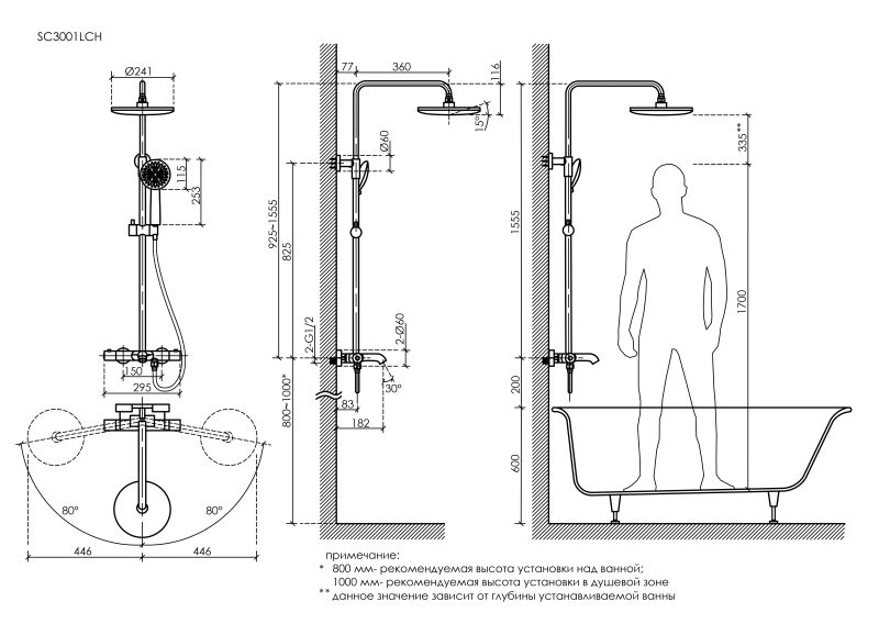 • Верхний душ из пластика ø240 мм с регулировкой наклона