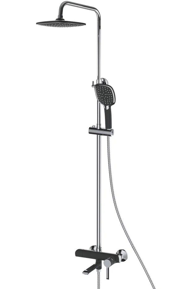 Душевая система Shevanik S6036H, черный/хром.Количество режимов струи: 1.Размер верхнего душа: 25,5x19 см.Управление: рычажное.Излив для наполнения ванны: да.