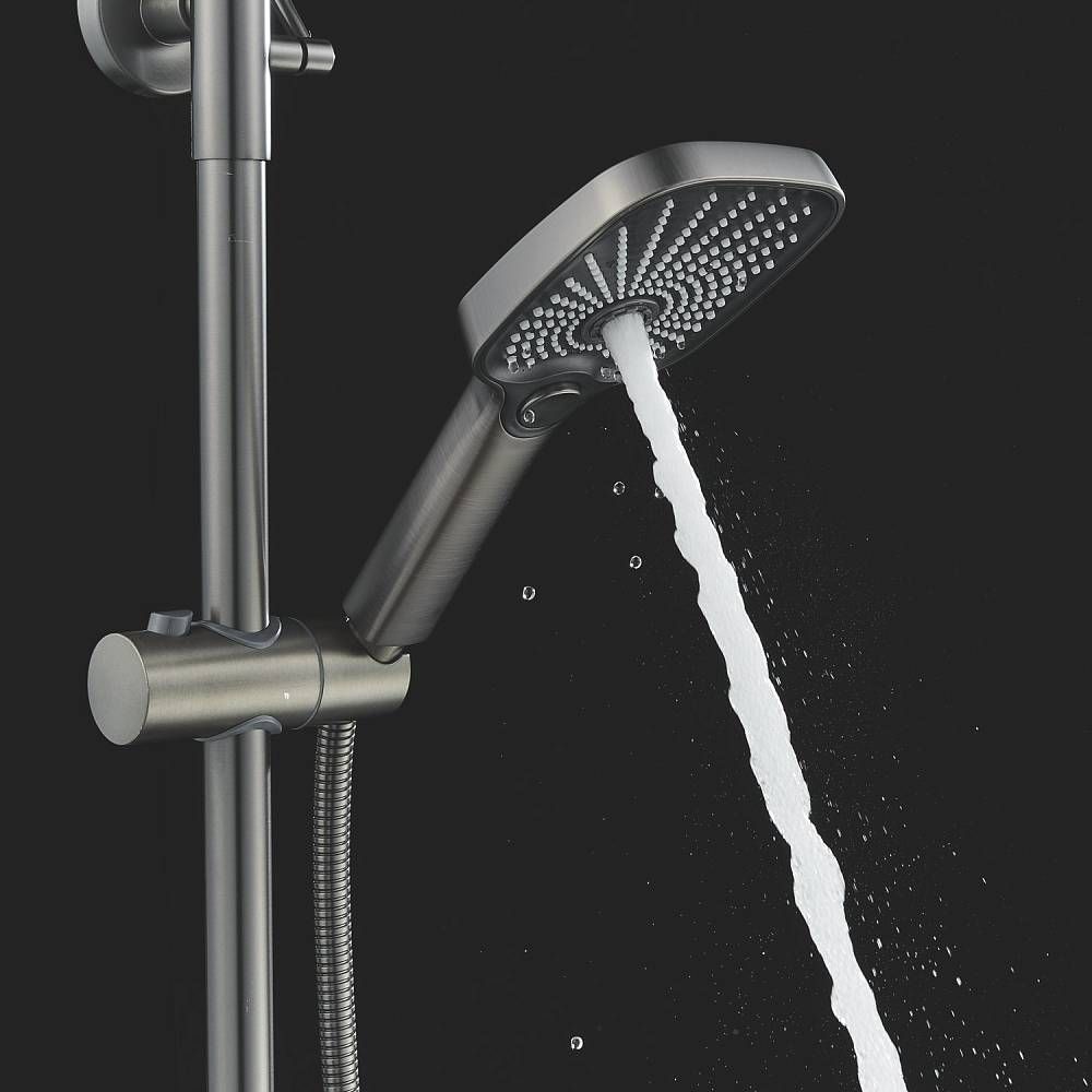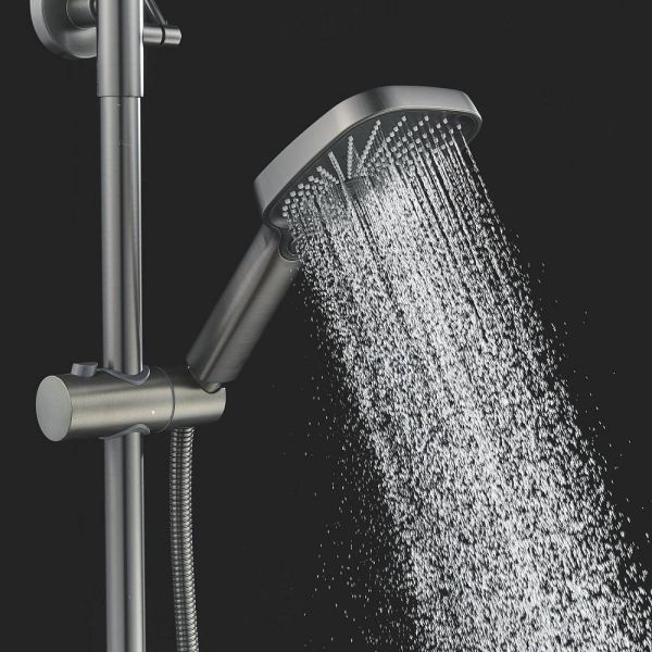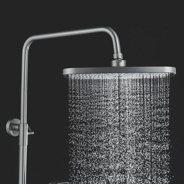 Верхний душ размером 300x190 мм из ABS-пластика регулируется по высоте благодаря телескопической штанге и по наклону с помощью встроенного шарнира, что обеспечивает максимальный комфорт и удобство использования. Самоочищающиеся силиконовые форсунки предотвращают образование известкового налета и сохраняют чистоту и силу потока воды.