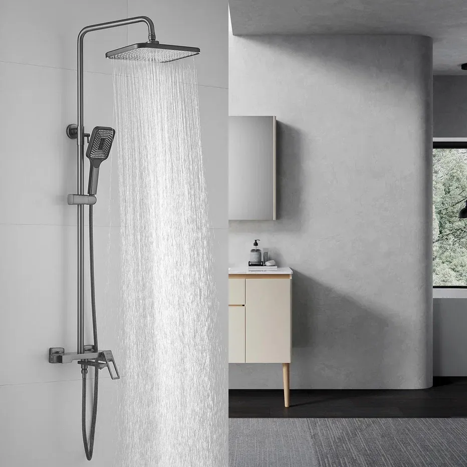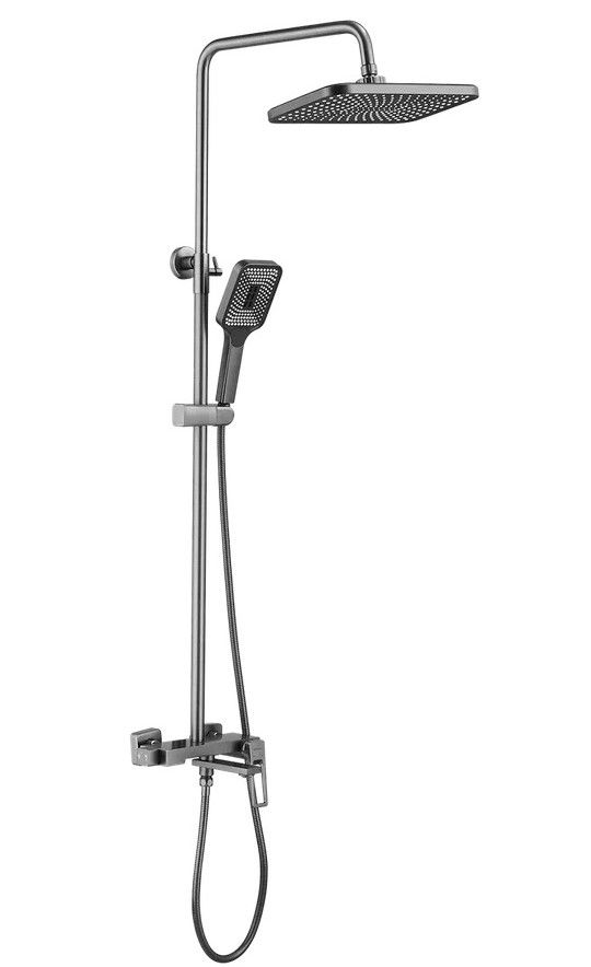 Душевая система Shevanik S6836T, оружейная сталь.Количество режимов струи: 3.Размер верхнего душа: 31x21,5 см.Управление: рычажное.Излив для наполнения ванны: да.