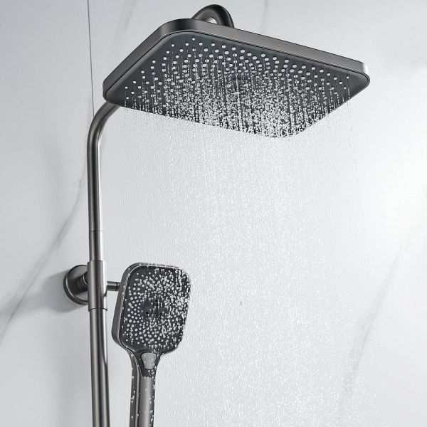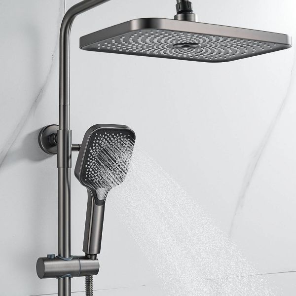 Душевая система Shevanik S9636T, оружейная сталь.Количество режимов струи: 3.Размер верхнего душа: 29x19,5 см.Управление: рычажное.Излив для наполнения ванны: да.