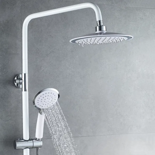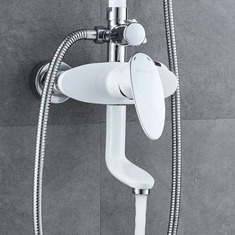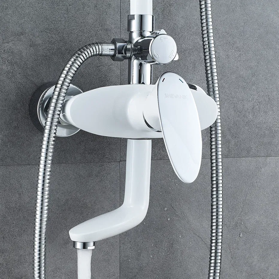Душевая система Shevanik S9836F, белый/хром.Количество режимов струи: 3.Размер верхнего душа: 23x23 см.Управление: рычажное.Излив для наполнения ванны: да.