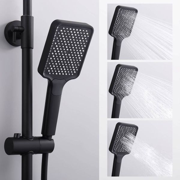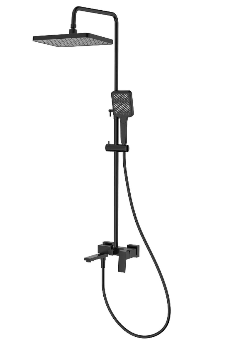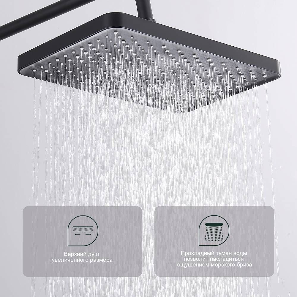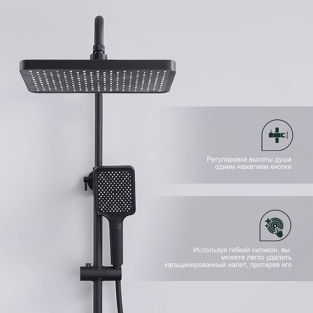 Душевая система Splenka S01.24.06. Цвет: черный. Материал: латунь. Управление: однорычажное. Механизм: керамический картридж. Излив: поворотный. Аэратор. Стандарт подводки: G 1/2. Форма верхнего душа: прямоугольная. Размер верхнего душа (ШхД): 320х210 мм. Количество режимов струи ручного душа: 3. Регулируемая душевая штанга: 620-1200 мм. Монтаж: на стену.