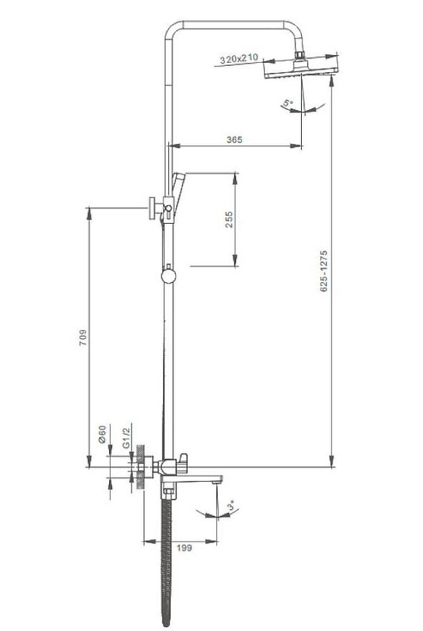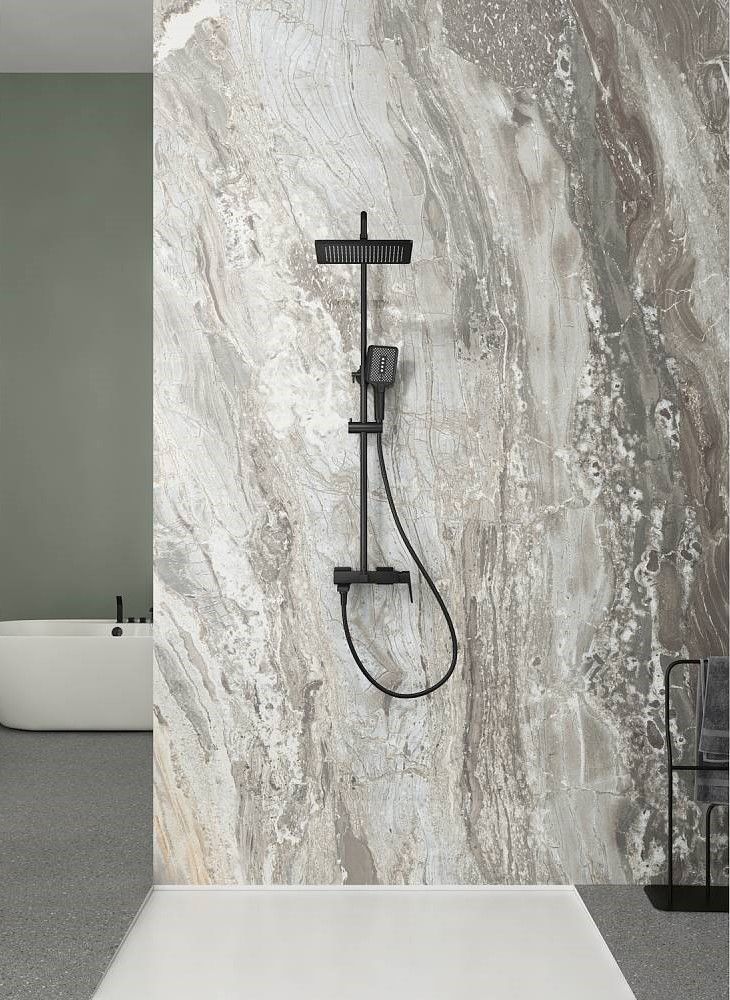 Душевая система Splenka S02.24.06. Цвет: черный. Материал: латунь. Управление: однорычажное. Механизм: керамический картридж. Излив: поворотный. Аэратор. Стандарт подводки: G 1/2. Форма верхнего душа: прямоугольная. Размер верхнего душа (ШхД): 320х210 мм. Количество режимов струи ручного душа: 3. Регулируемая душевая штанга: 625-1275 мм. Монтаж: на стену.