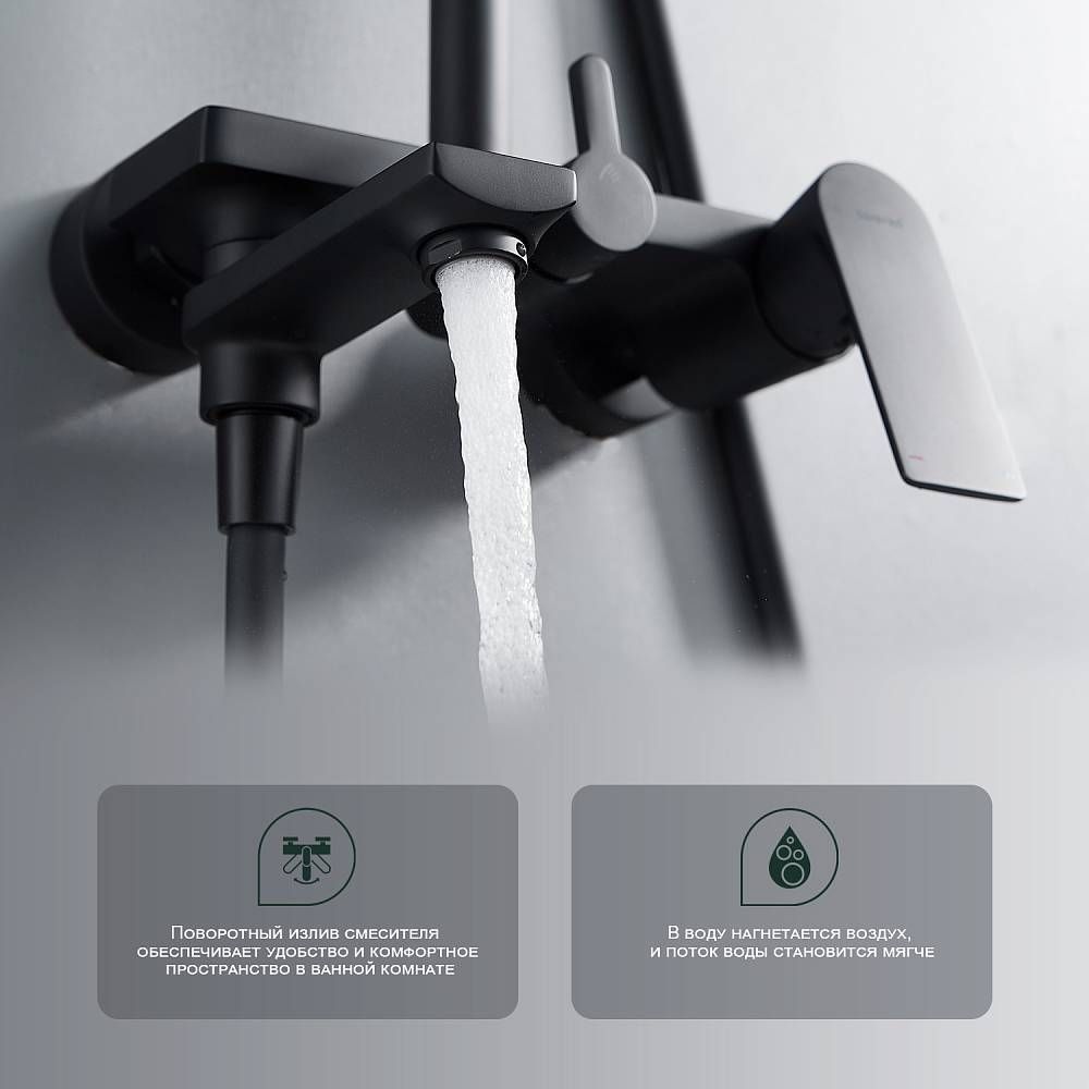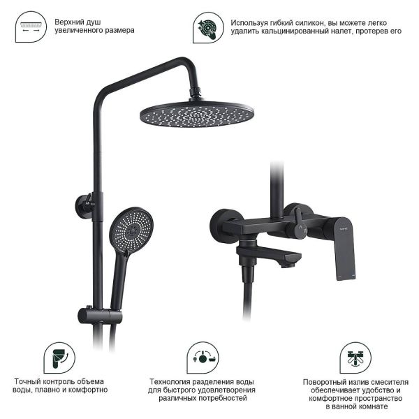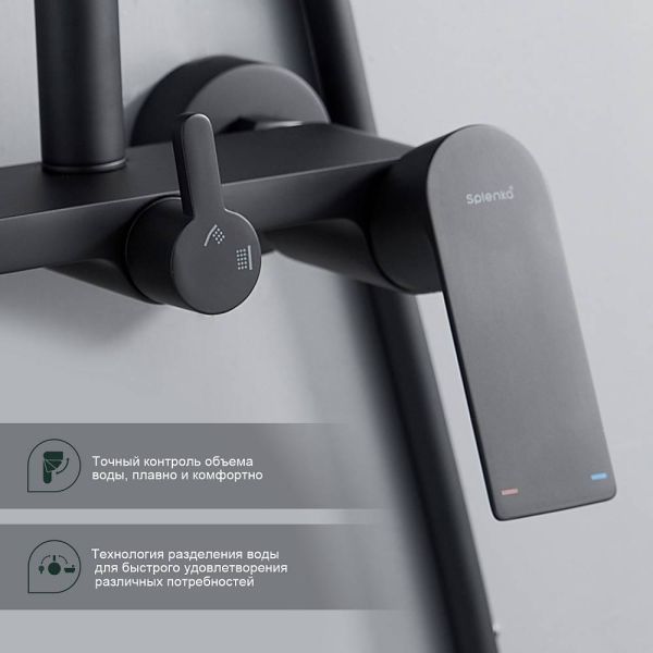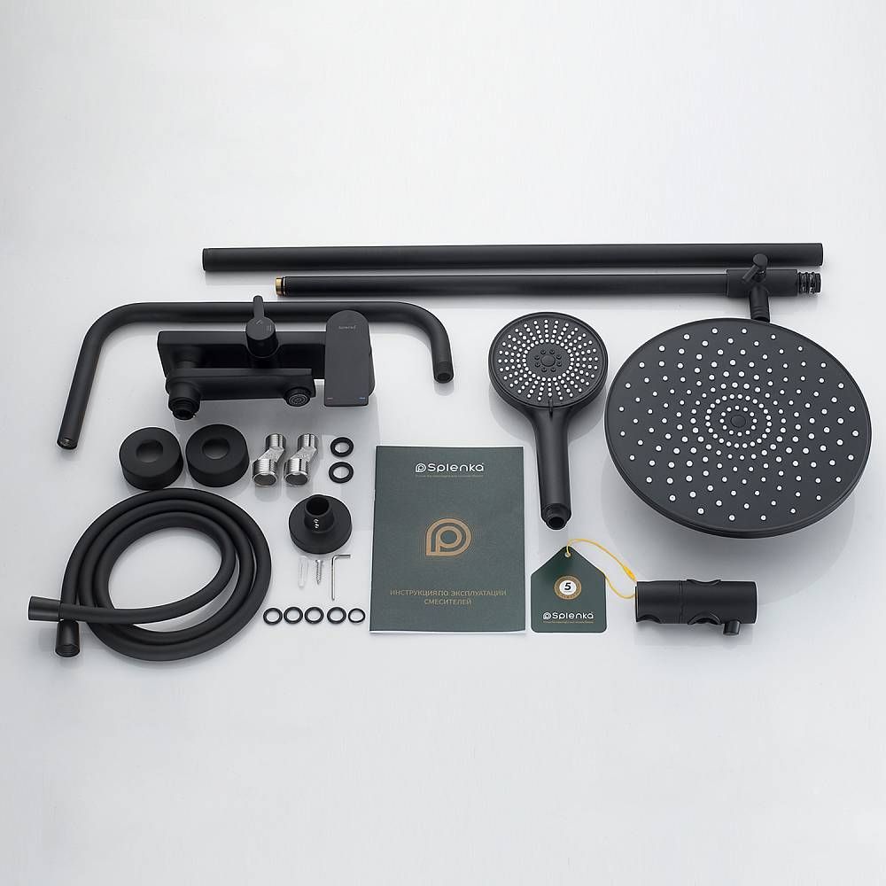 Душевая система Splenka S05.24.06. Цвет: черный. Материал: латунь. Управление: однорычажное. Механизм: керамический картридж. Излив: поворотный. Аэратор. Стандарт подводки: G 1/2.