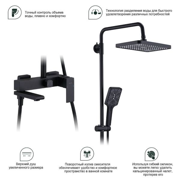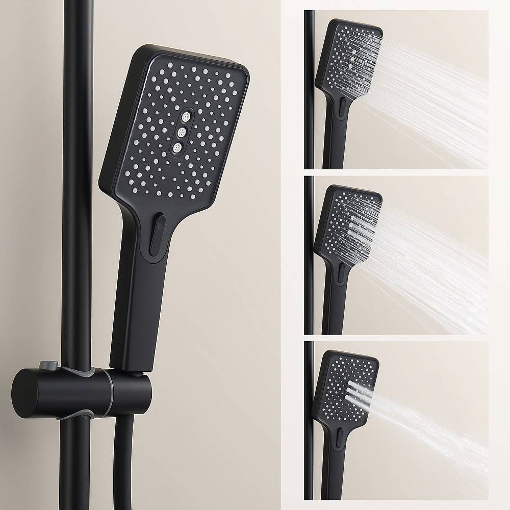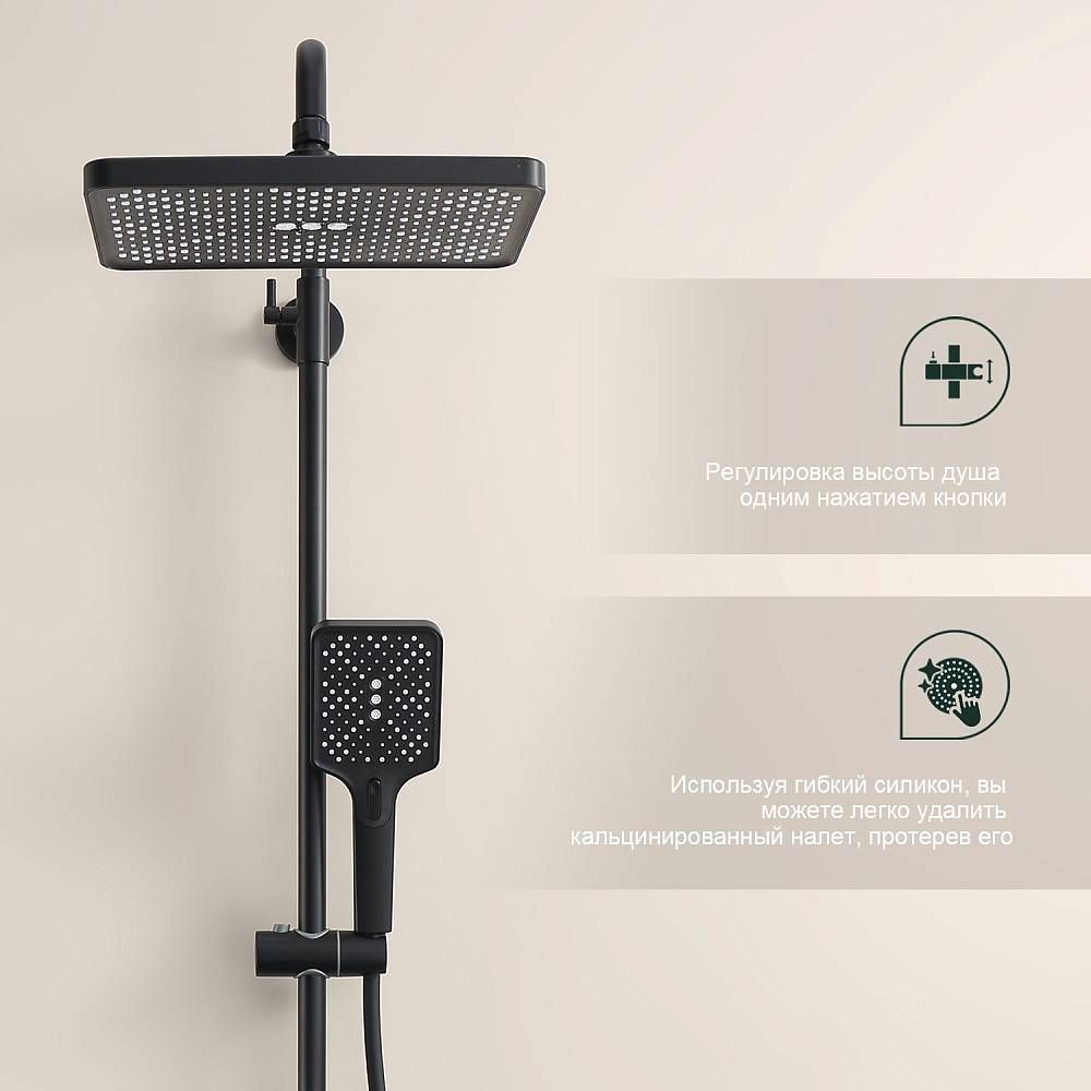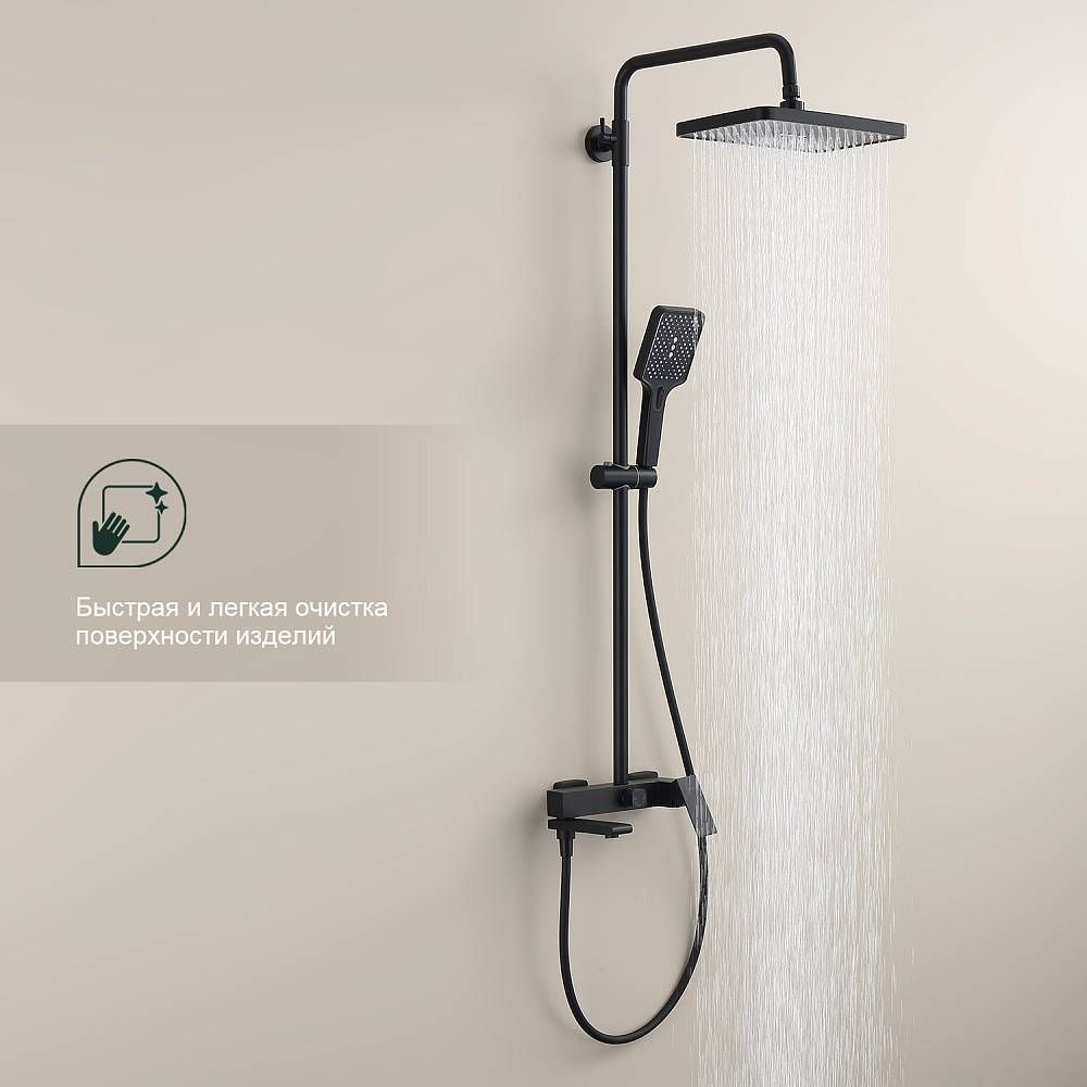 Душевая система Splenka S224.24.06, черный. Материал: нержавеющая сталь. Управление: однорычажное. Механизм: керамический картридж. Стандарт подводки: G 1/2. Форма верхнего душа: квадратная. Размер верхнего душа (ШхД): 300х210 мм. Количество режимов струи ручного душа: 3. Регулируемая душевая штанга. Излив - функция переключения.