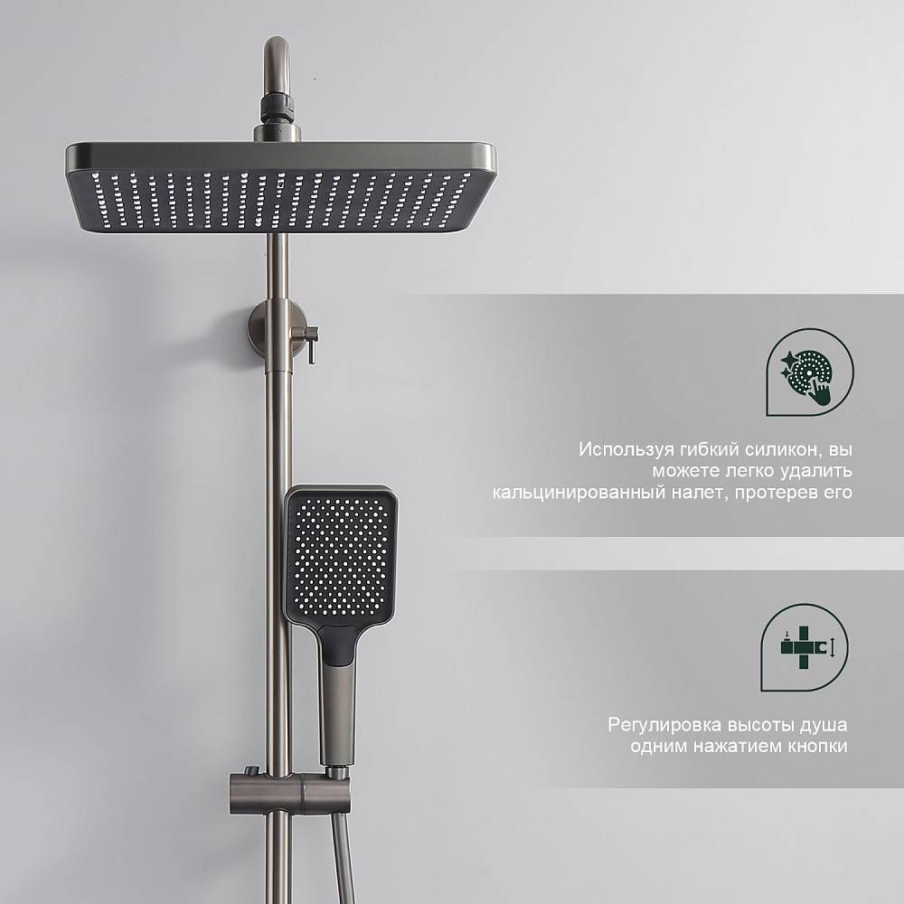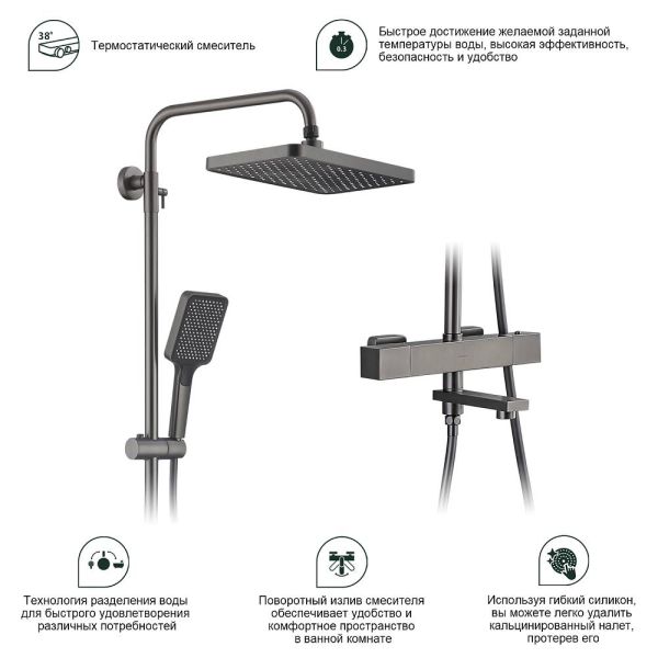 Душевая система с термостатом Splenka S224.26.09, графит. Управление: термостат. Механизм: термостатический картридж. Стандарт подводки: G 1/2. Размер верхнего душа (ШхД): 320х210 мм. Количество режимов струи ручного душа: 3. Регулируемая душевая штанга: 1160-1560 мм. Монтаж: на стену. Излив - функция переключения.