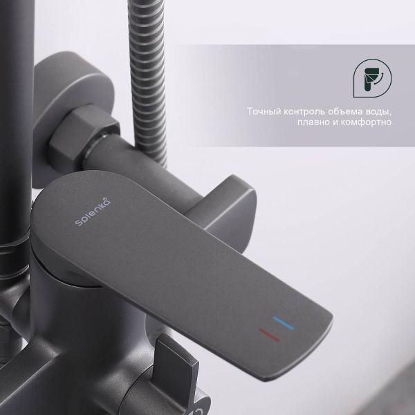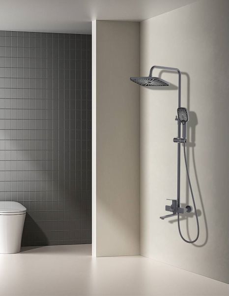 Душевая система Splenka S40.24.07. Цвет: серый. Материал: латунь. Управление: однорычажное. Механизм: керамический картридж. Излив: поворотный. Аэратор. Стандарт подводки: G 1/2. Форма верхнего душа: прямоугольная. Размер верхнего душа (ШхД): 300х190 мм. Количество режимов струи ручного душа: 3. Переключение режимов ручного душа: кнопочное. Регулируемая по высоте душевая штанга: 950-1350 мм. Регулируемый по высоте держатель ручного душа. Монтаж: на стену.