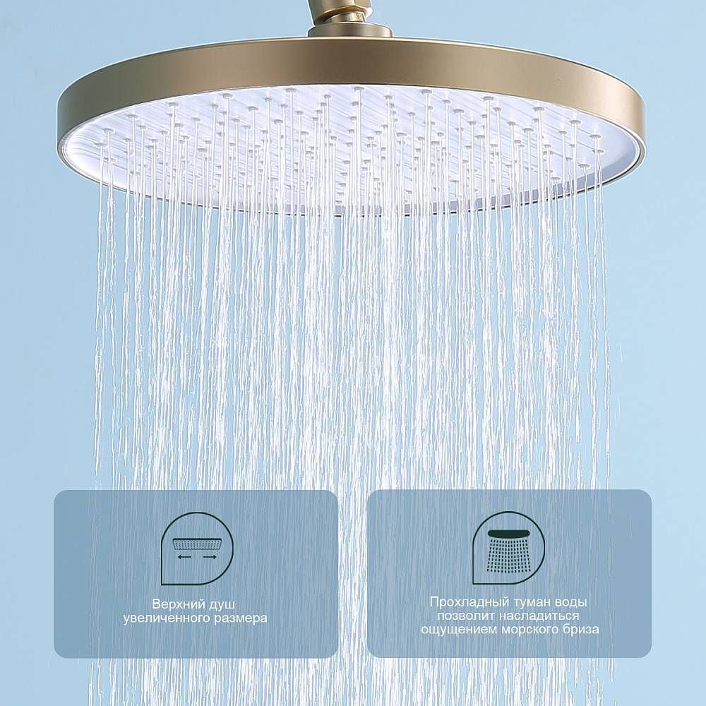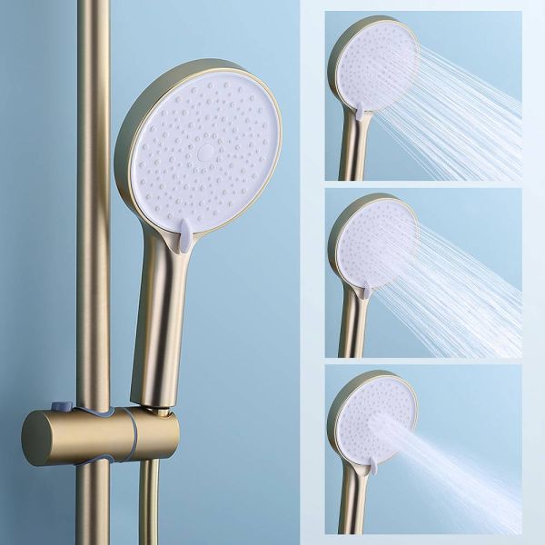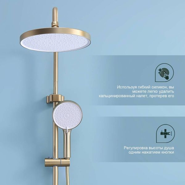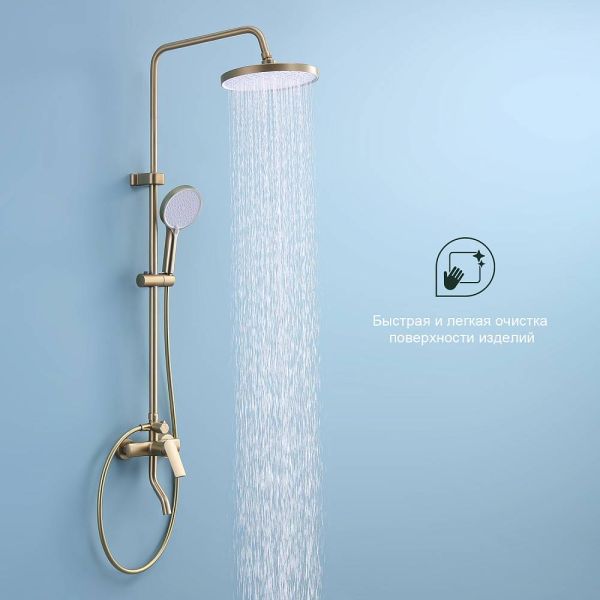 Душевая система Splenka S50.24.03, сатин золотой. Душевая система подходит для ванны и душа. Верхний душ имеет круглую форму размером 25 см. Ручная лейка у системы 3-х режимная. Лейки изготовлены из авс-пластика.