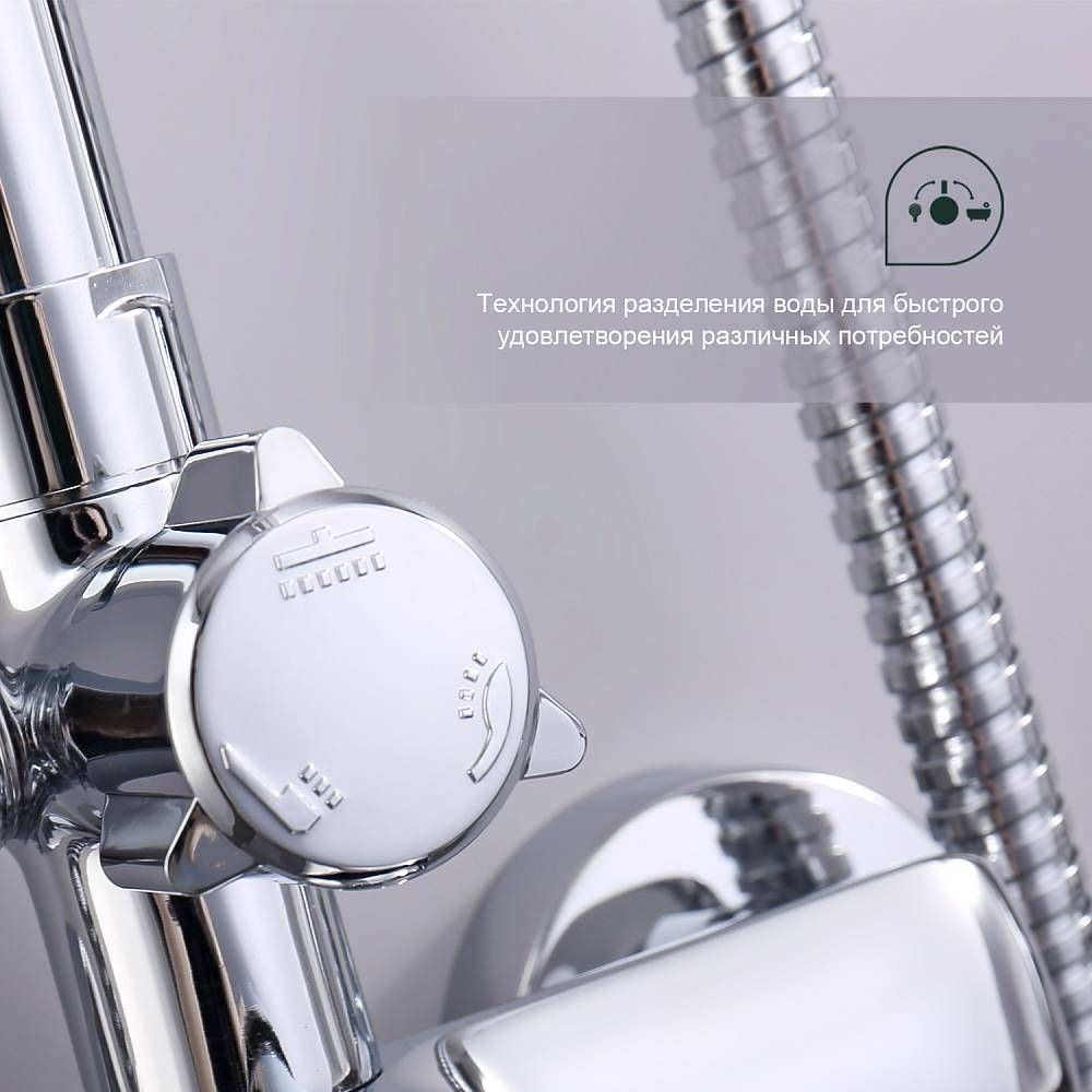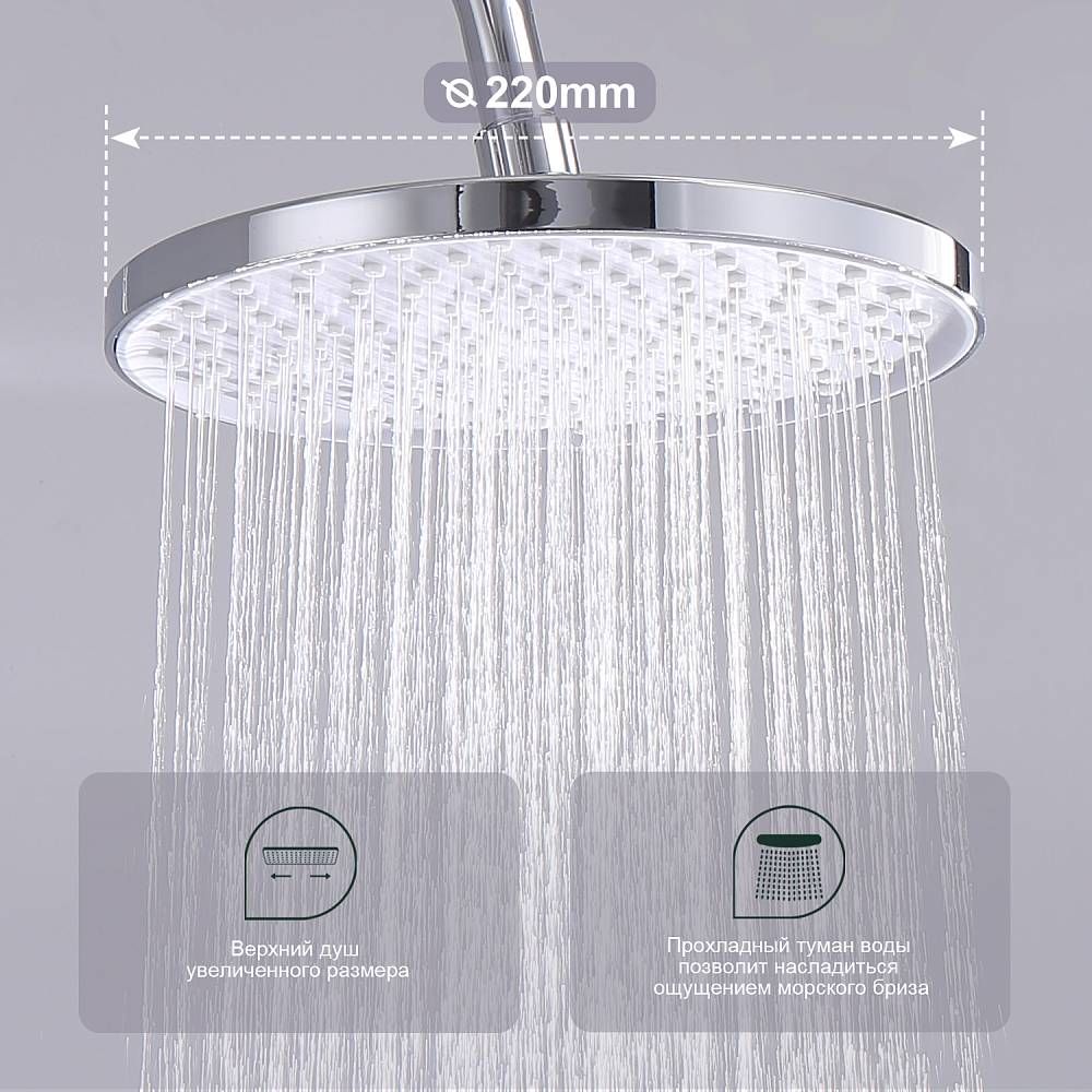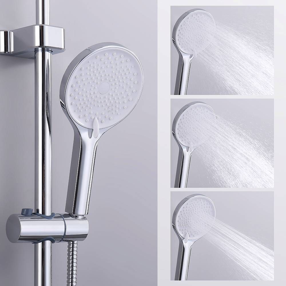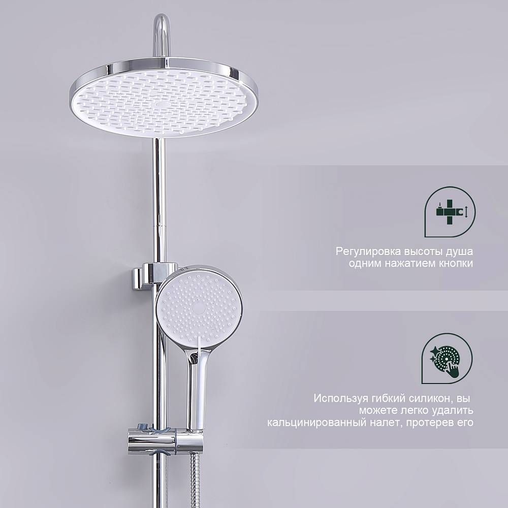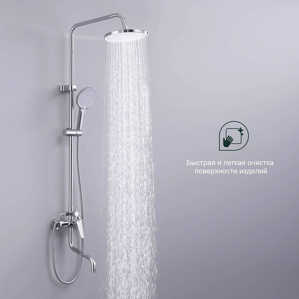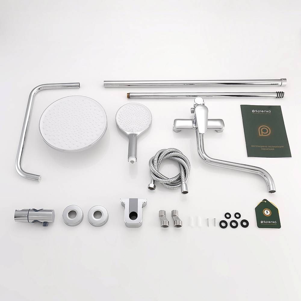 Душевая система Splenka S51.24, хром. Душевая система подходит для ванны и душа. Верхний душ имеет круглую форму размером 22 см, Ручная лейка у системы 3-х режимная. Лейки изготовлены из авс-пластика. Изделие выполнено в хроме, корпус латунный. Гарантия 5 лет.