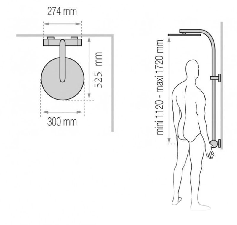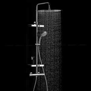 Ультра тонкий дизайн. -Эксклюзивный, экстра-плоский верхний тропический душ D300 mm. Ручной Душ: -Душ D 95 mm ABS с 3-х позиционной массажной лейкой система Декальцинации (легкая очистка известковых отложений) -Экономичный расход воды -Хромированные корпус и резьба -Гибкий силиконовый шланг 1.75 м. Штанга: -Душевая штанга из нержавеющей стали с закрепляющимися двухсторонними мыльницами (дополнительная опция) -Регулировка по высоте min 1120 max 1720 mm. -Пристенный вариант установки. -Термостатический смеситель NF.Блокируемая температура +38 C с функцией Анти-Ожог