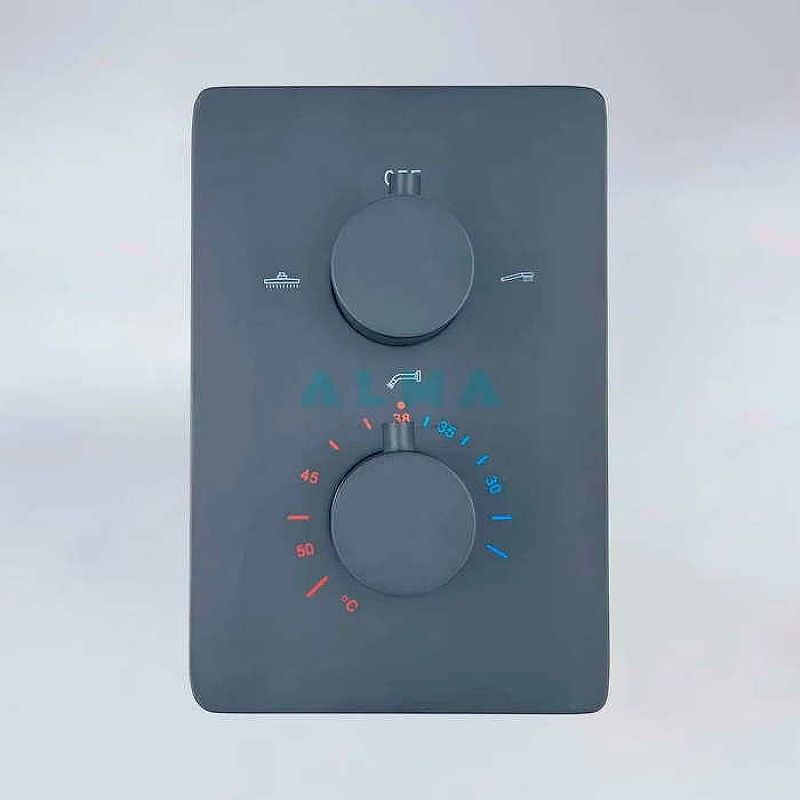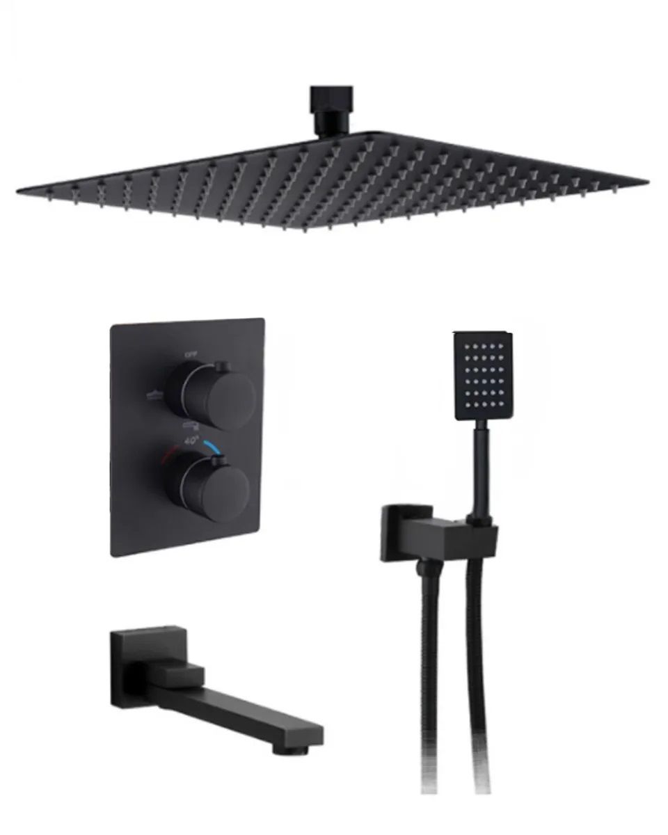 В правильно выполненном дизайне ванной комнаты нет ни одной лишней детали. Душевая система- это не только высококачественные современные технологии, это стильный дизайн и возможность добавить интересный акцент. Например, выбрав элегантный встраиваемый душевой комплект Weber с термостатом на 3 положения, цвет черный матовый Душ для тех, кто ценит каждый момент своей жизни. Комплектация: ? Излив поворотный латунь 24 см. ? Верхняя лейка нержавеющая сталь размер 25*25 см. ? Длинна верхнего кронштейна 40 см. ? Шланг 150 см. ? Лейка ручная нержавеющая сталь. ? Встраиваемый смеситель, материал латунь ? Глубина его погружения в стену 8 см